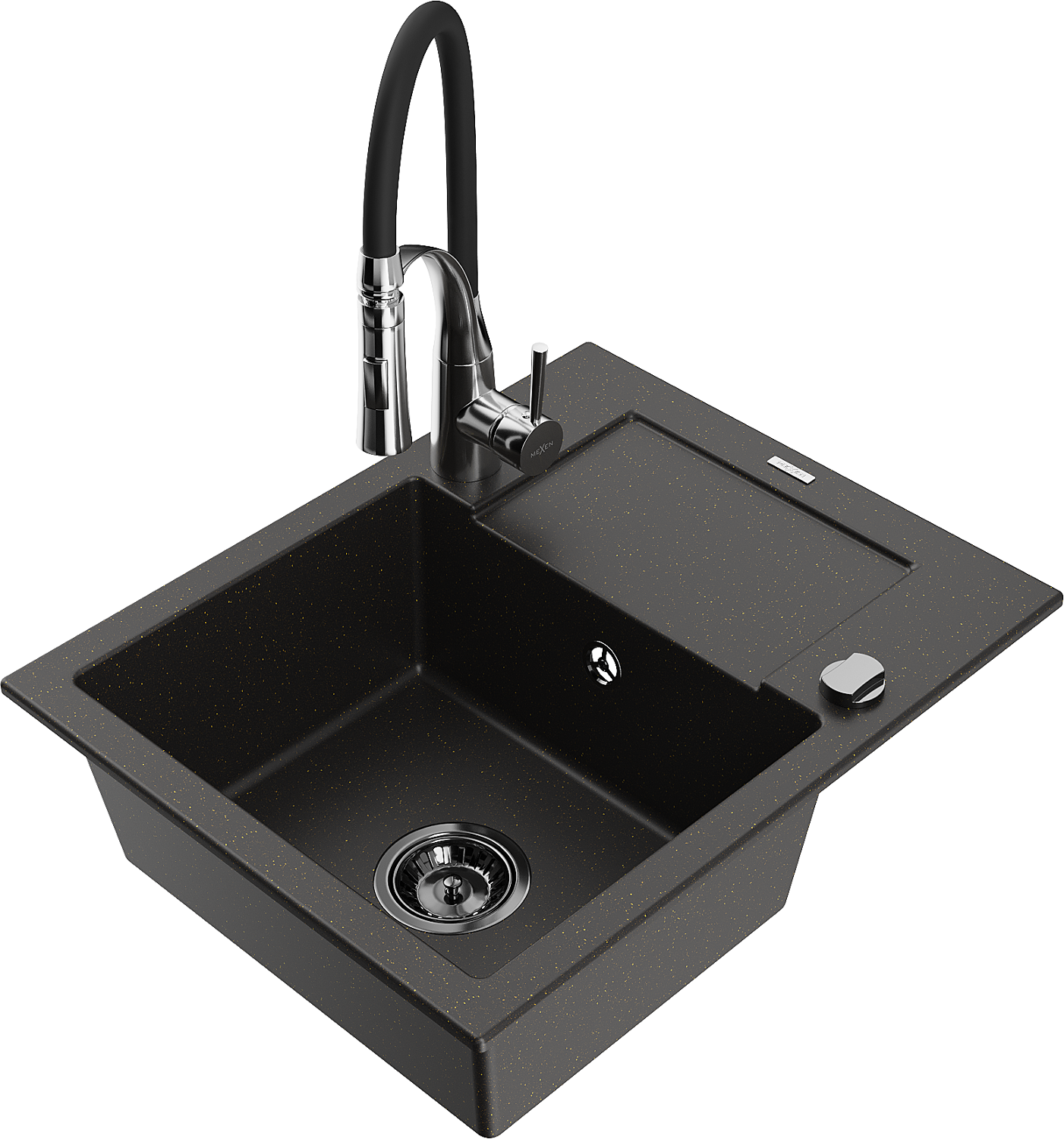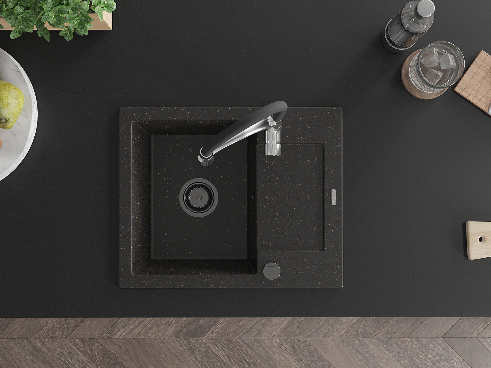 Mexen Enzo гранитна мивка с една камера с отцедник и кухненски смесител Aster, черен/златен металик - 6506-75-73450-07-B