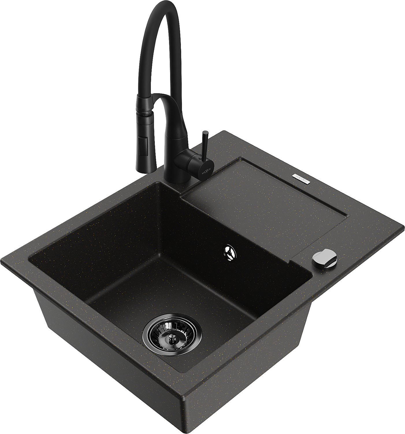Mexen Enzo гранитна мивка с 1 гнездо с отцедник и кухненски смесител Aster, черно/златист металик - 6506-75-73450-70-B