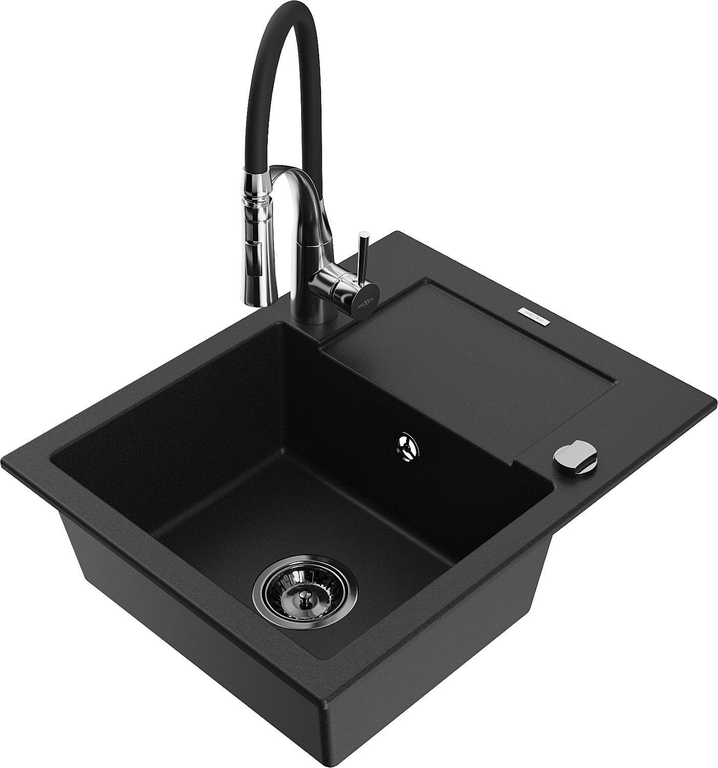 Mexen Enzo гранитна кухненска мивка с 1 отделение с отцедник и кухненски смесител Aster, черен - 6506-77-73450-07-B