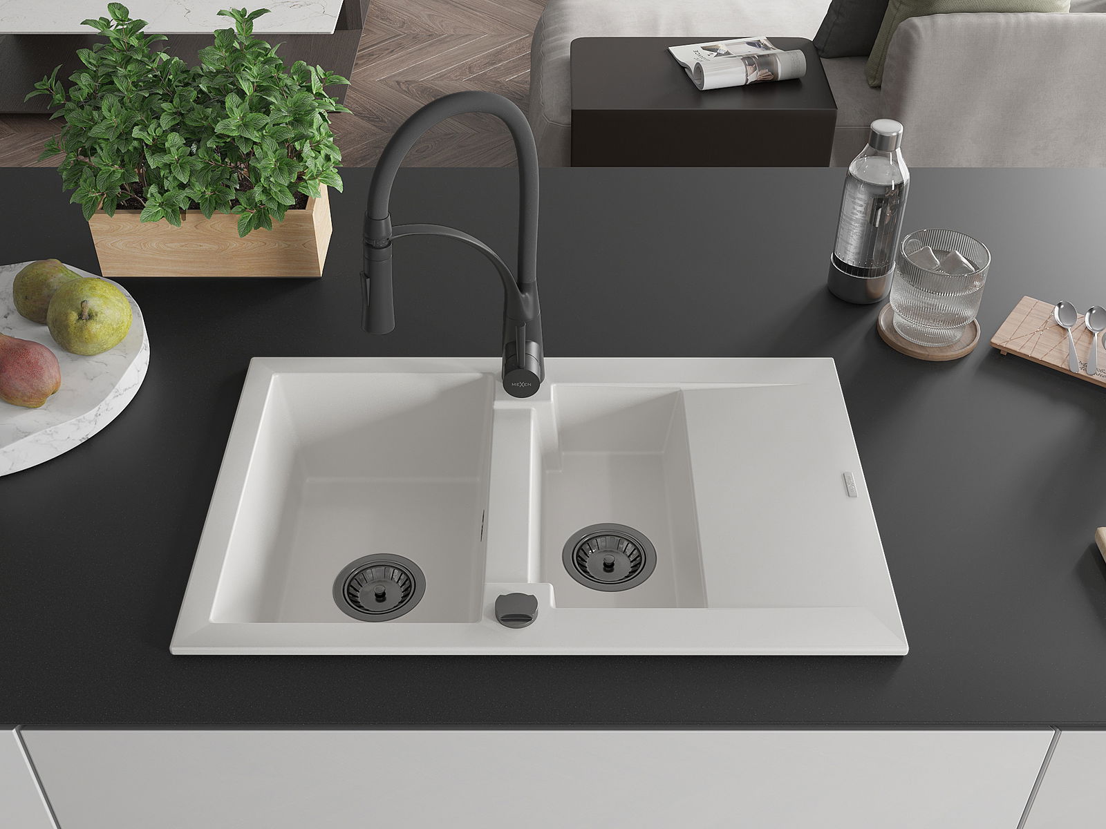 Mexen Gaspar гранитна мивка с 1,5 камери с дренаж и кухненски смесител Aster, бяла - 6507-20-73450-70-B
