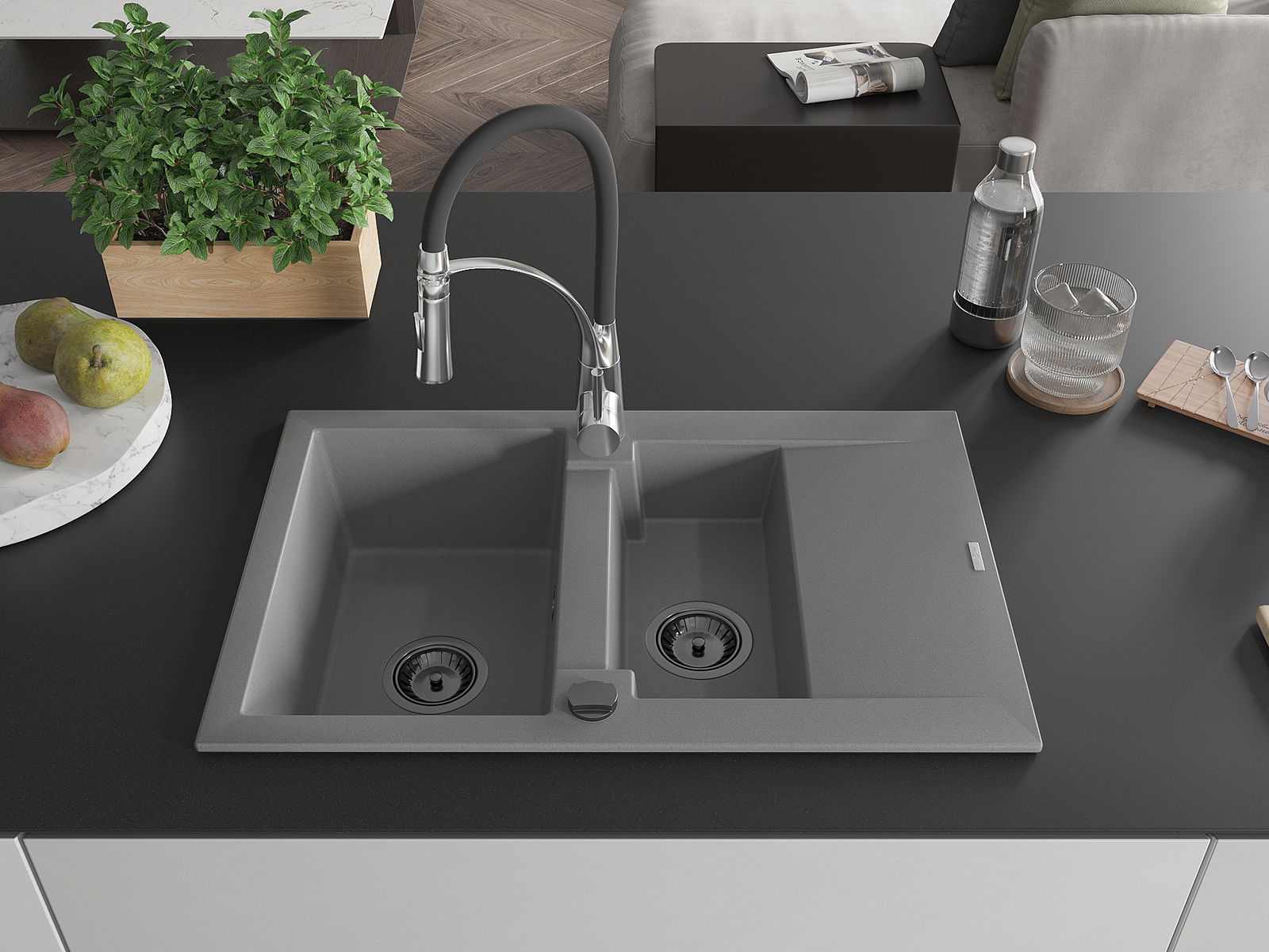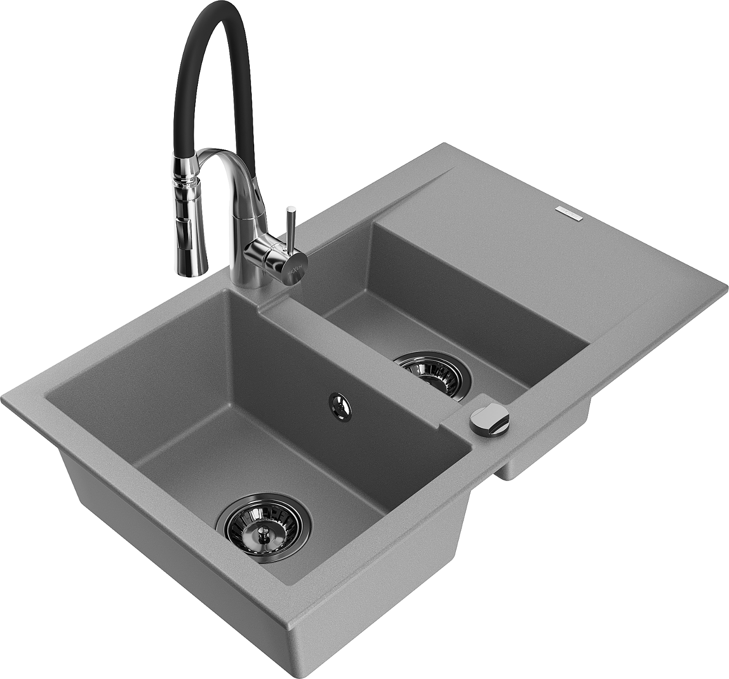 Mexen Gaspar гранитна мивка с 1,5 камери с отцеждач и кухненски смесител Aster, сив - 6507-71-73450-07-B