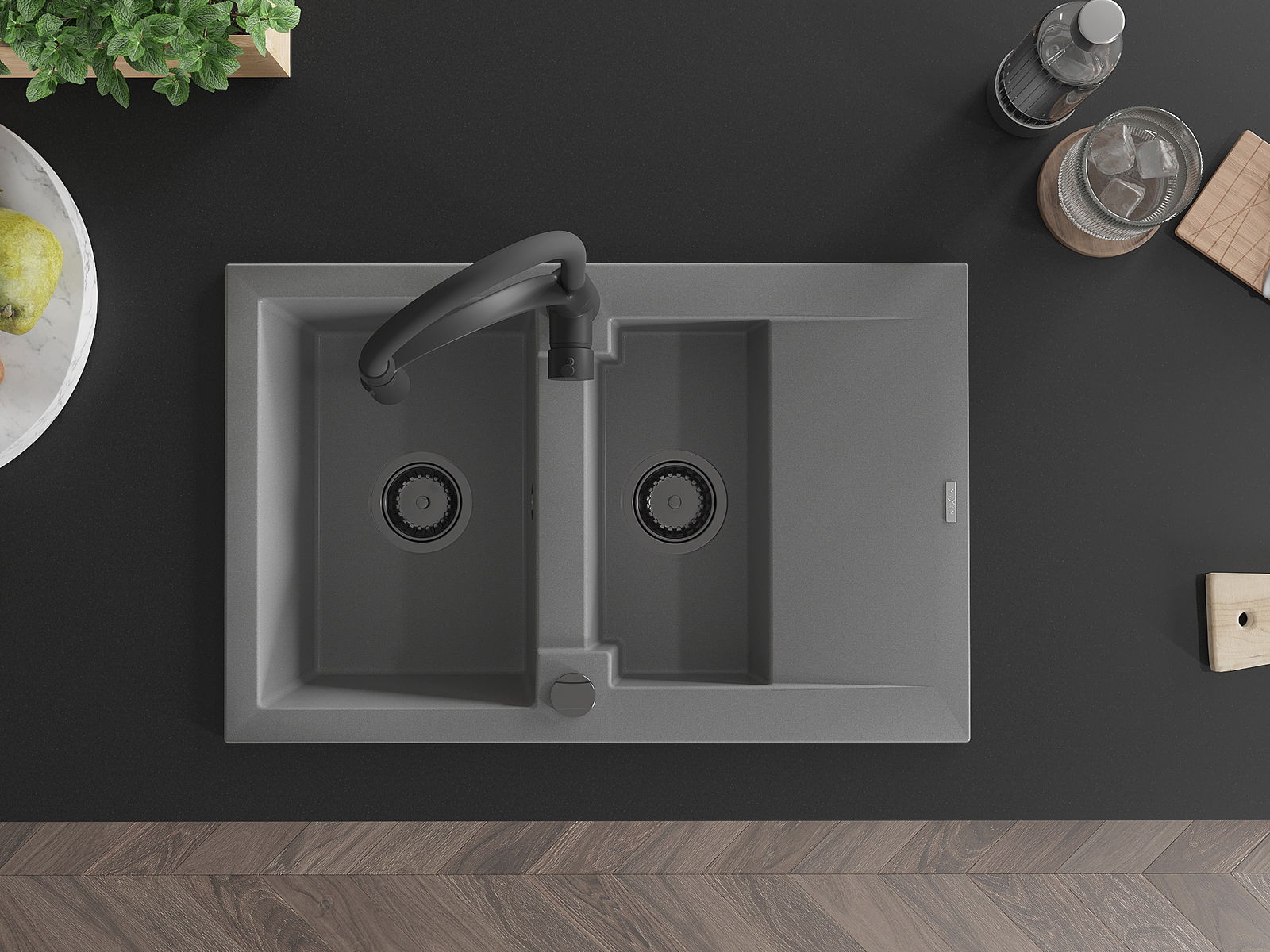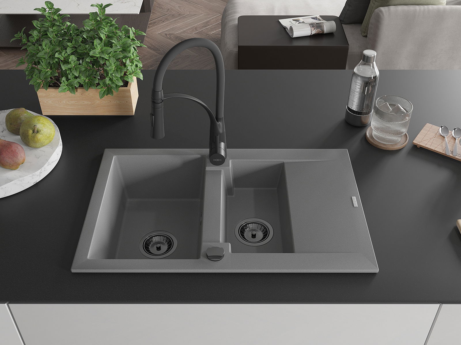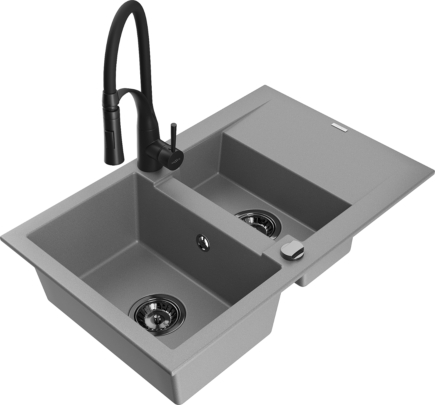 Mexen Gaspar гранитна мивка 1,5-камерна с отцедник и кухненски смесител Aster, сив - 6507-71-73450-70-B