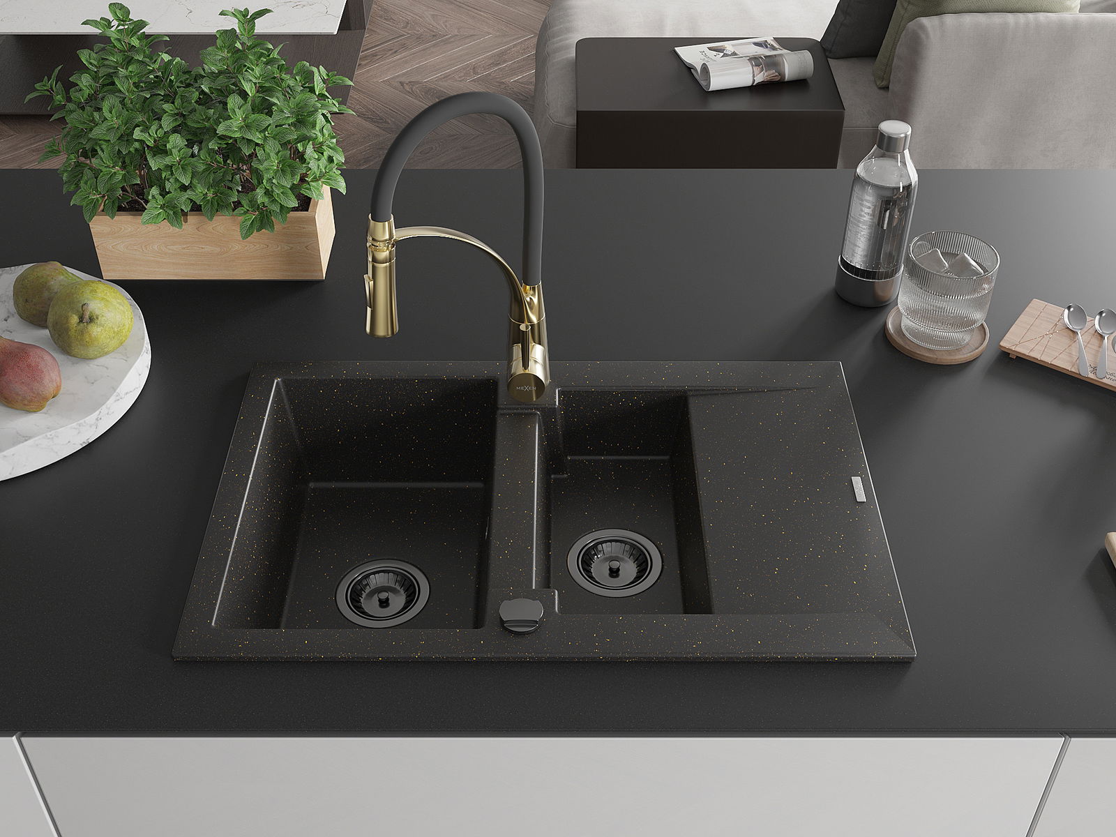 Mexen Gaspar гранитна мивка 1,5-камерна с отцедник и кухненски смесител Aster, черен/златист металик - 6507-75-73450-57-B