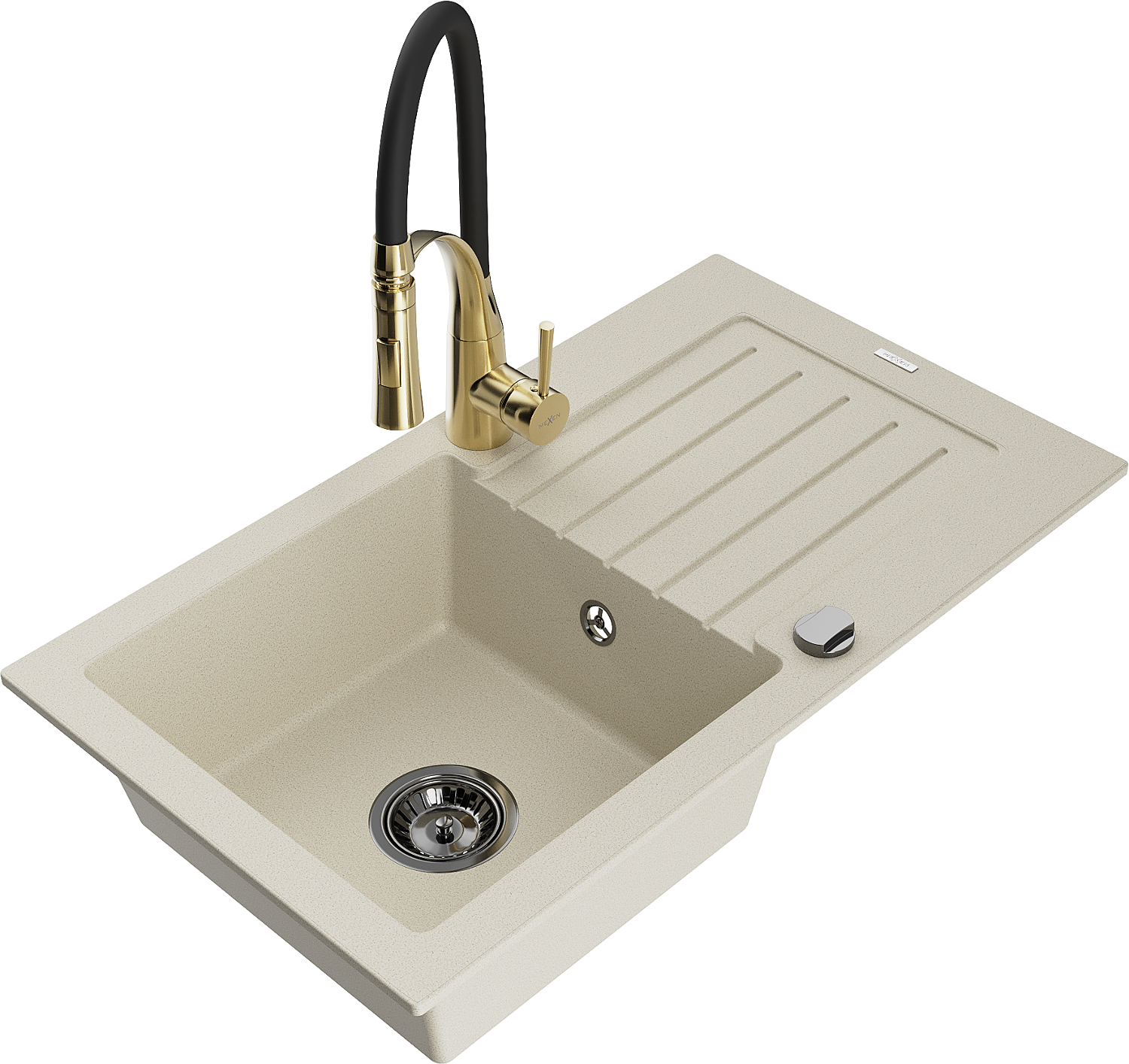 Mexen Pablo гранитна мивка с 1 корито с отцедник и кухненски смесител Aster, бежов - 6510-69-73450-57-B