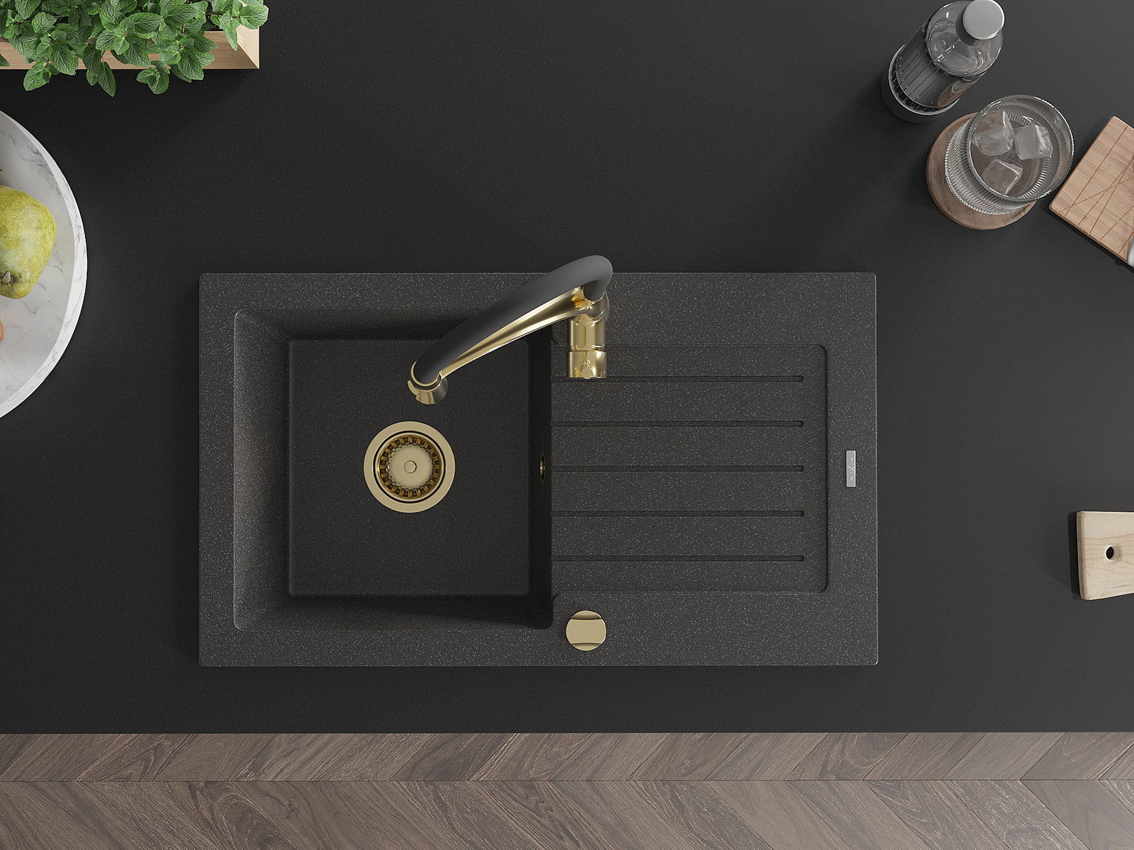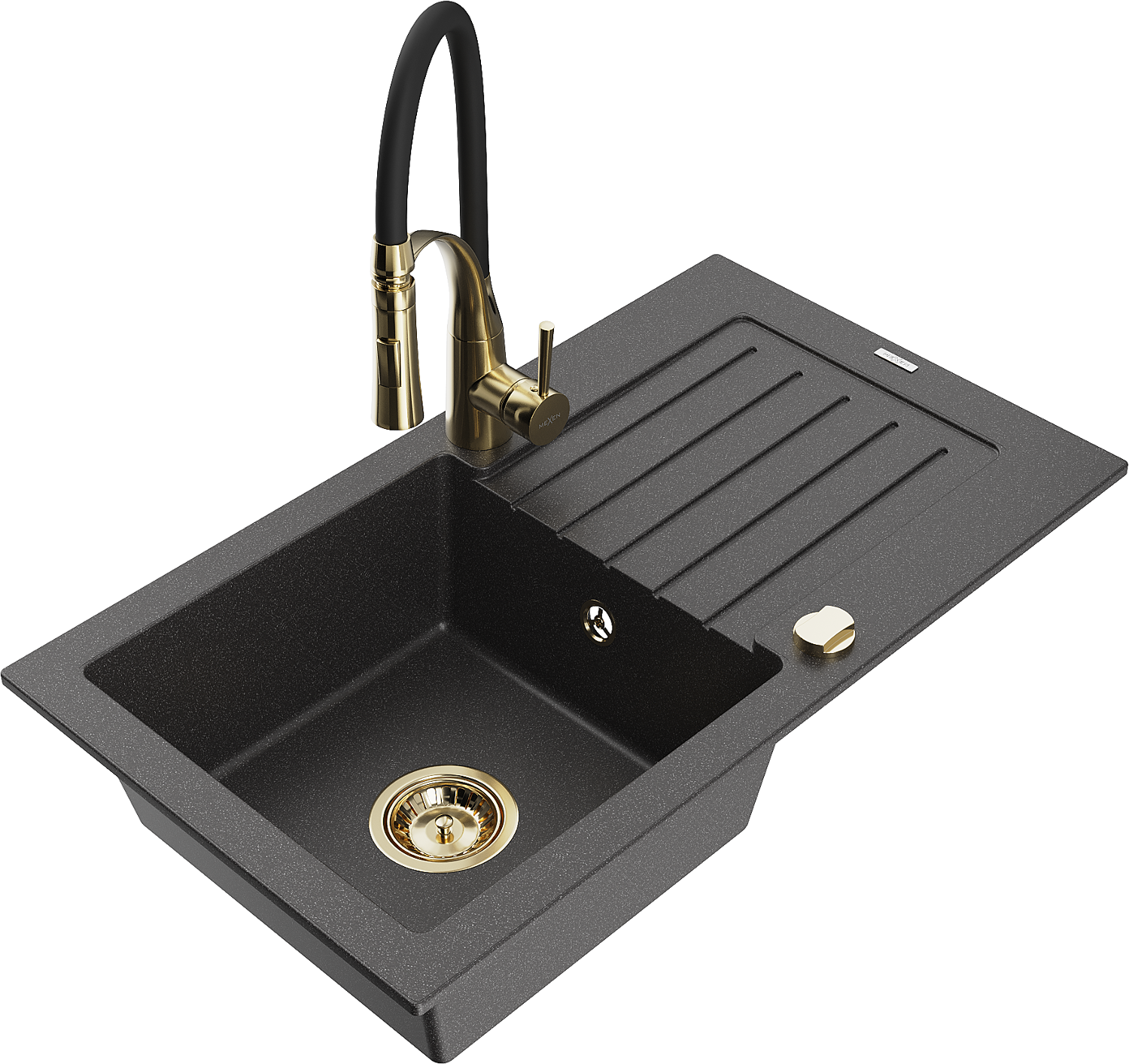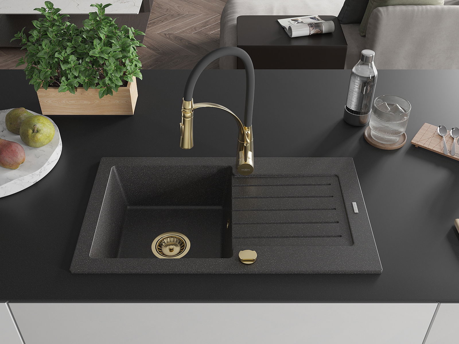 Mexen Pablo гранитна мивка с 1 гнездо и отцедник и кухненски смесител Aster, черен на точки - 6510-76-73450-57-G