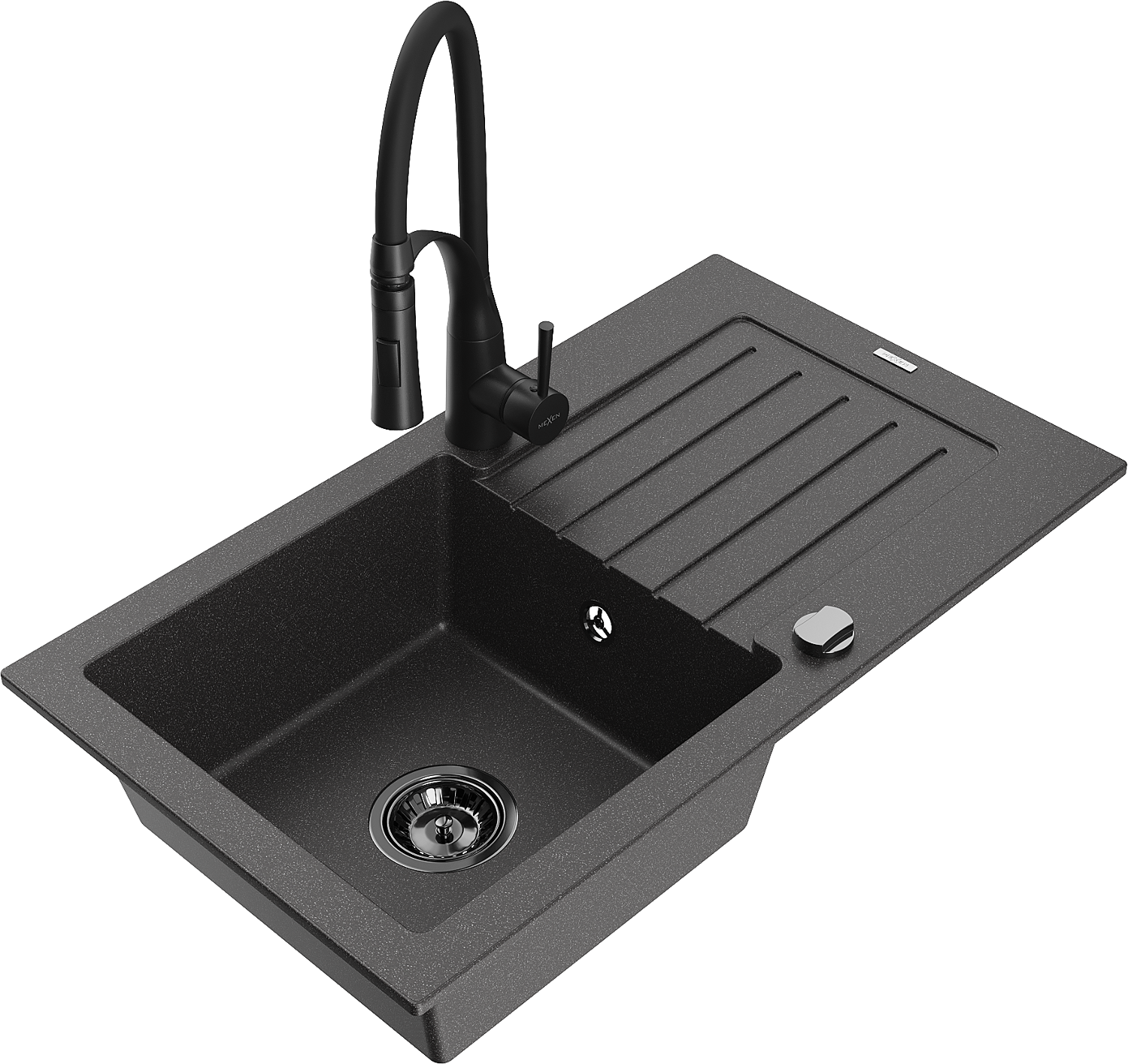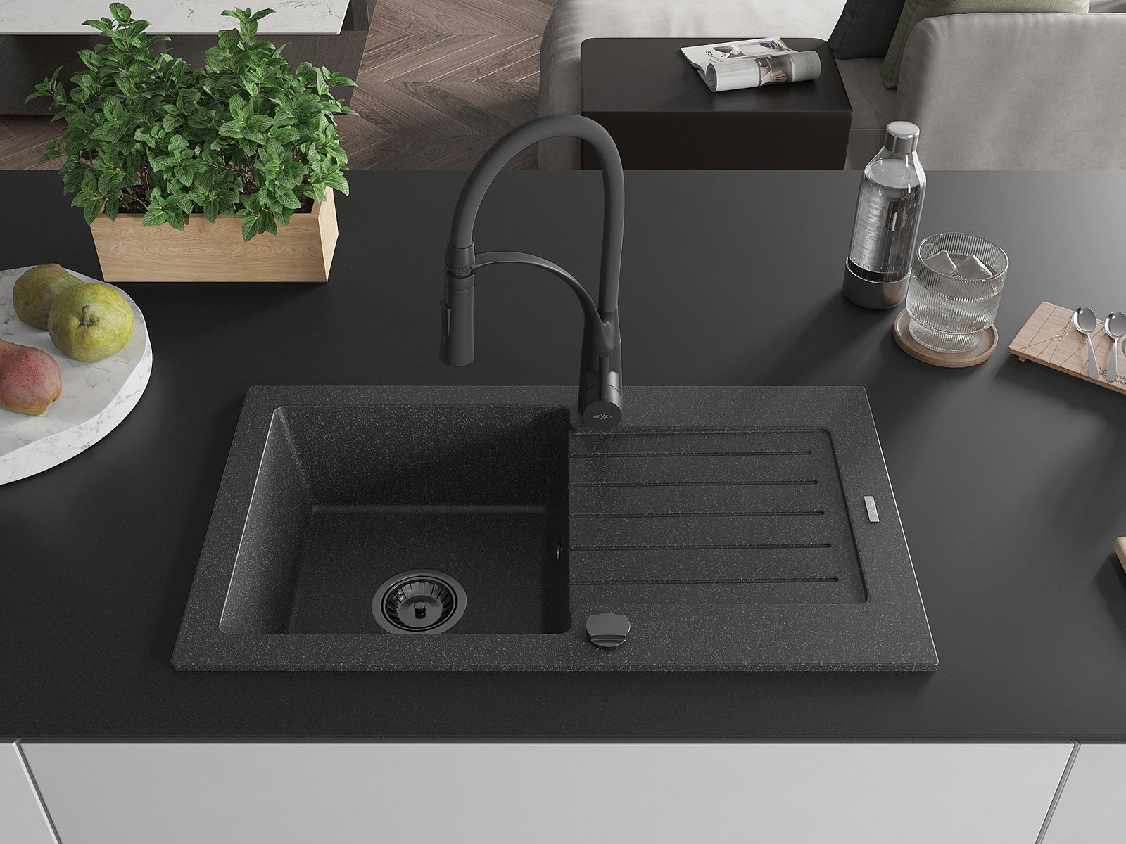 Mexen Pablo еднокамерен гранитен мивка с отцедник и кухненски смесител Aster, черен на пръски - 6510-76-73450-70-B