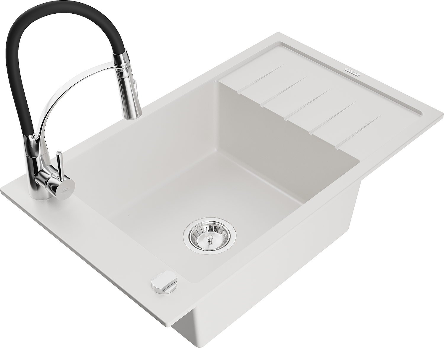 Mexen Elias кухненска мивка гранитна 1-камерна с отцедник и кухненски смесител Aster, бяла - 6511-20-73450-07