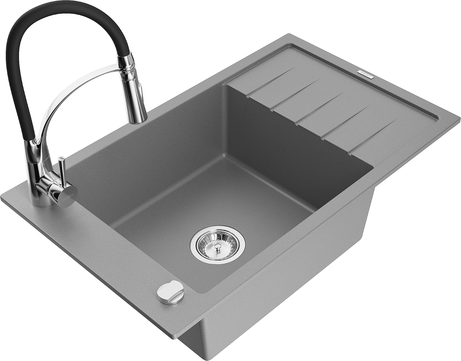 Mexen Elias еднокоморна гранитна кухненска мивка с отцедник и кухненски смесител Aster, сив - 6511-71-73450-07