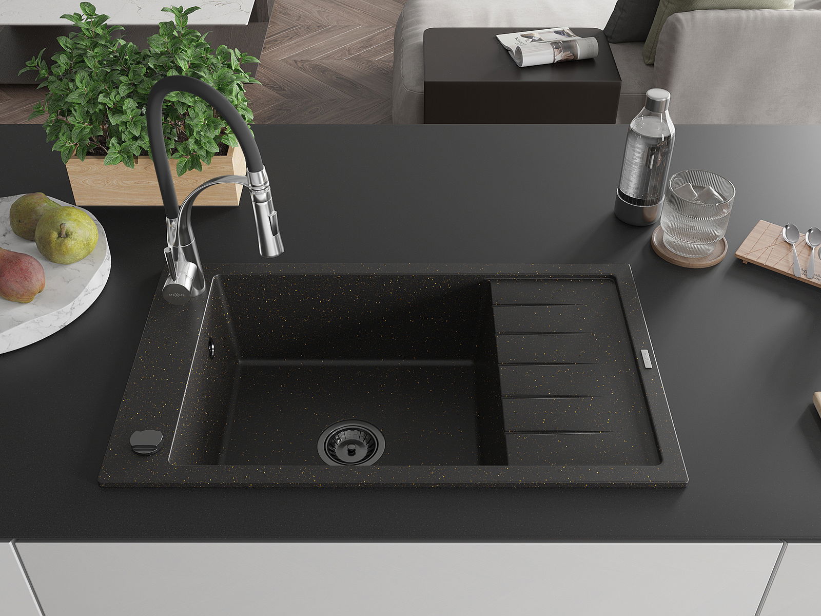 Mexen Elias гранитна мивка с 1 камера с отцедник и кухненски смесител Aster, черен/златен металик - 6511-75-73450-07-B
