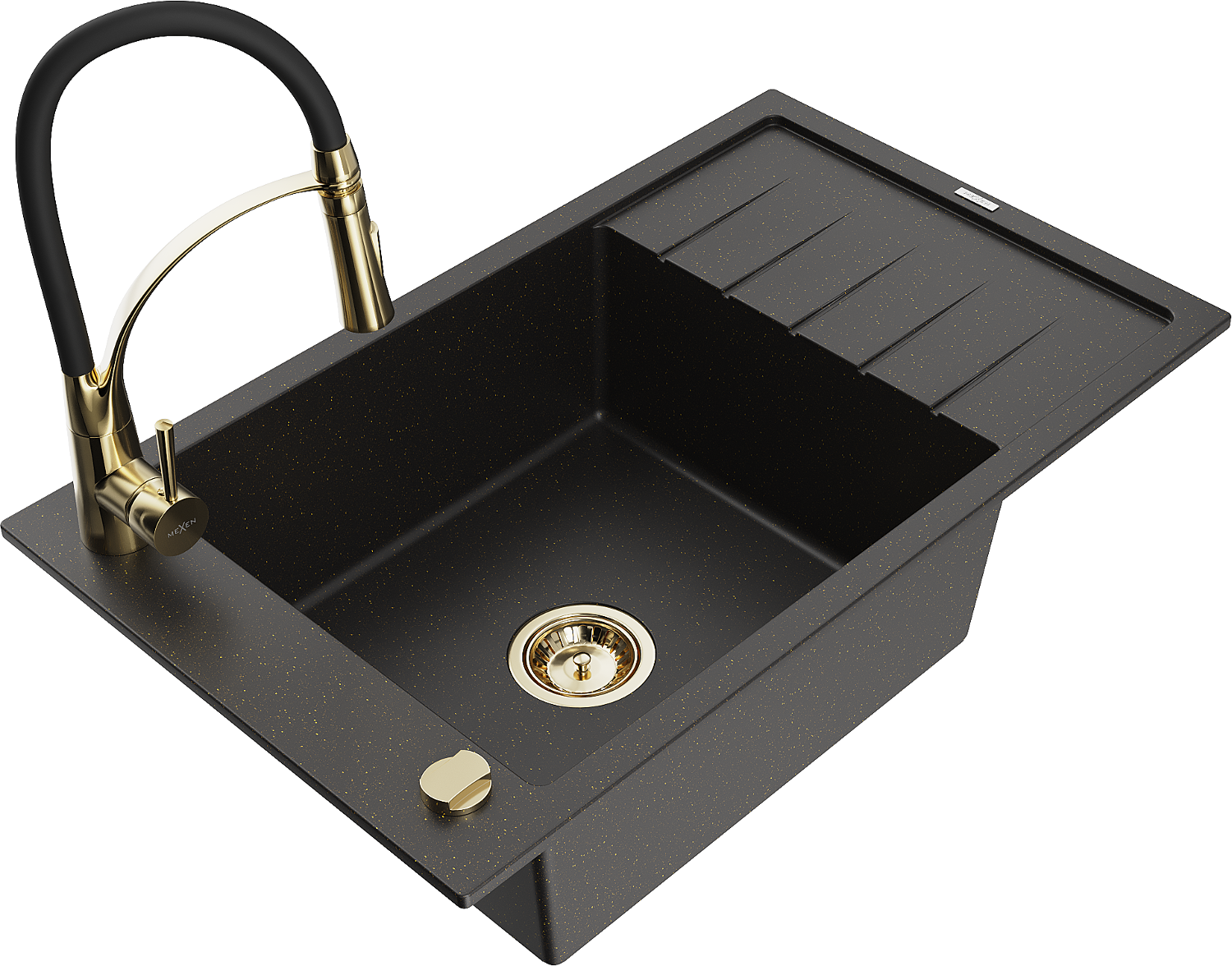 Mexen Elias гранитна мивка с 1 отделение, с отцедник и кухненски смесител Aster, черен/металик злато - 6511-75-73450-57-G