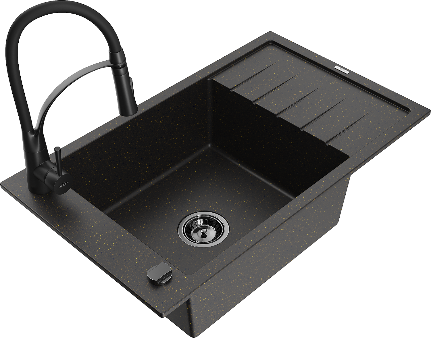 Mexen Elias гранитна мивка с 1 отделение с отцедник и кухненски смесител Aster, черен/златист металик - 6511-75-73450-70-B