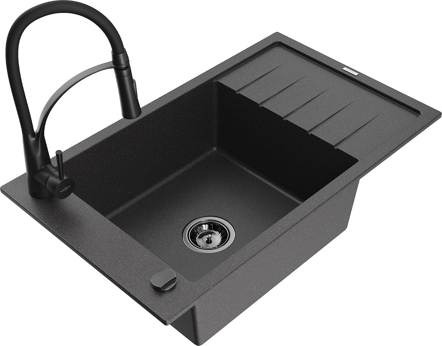 Mexen Elias гранитна мивка с 1 отделение, отцедник и кухненски смесител Aster, черно на пръски - 6511-76-73450-70-B