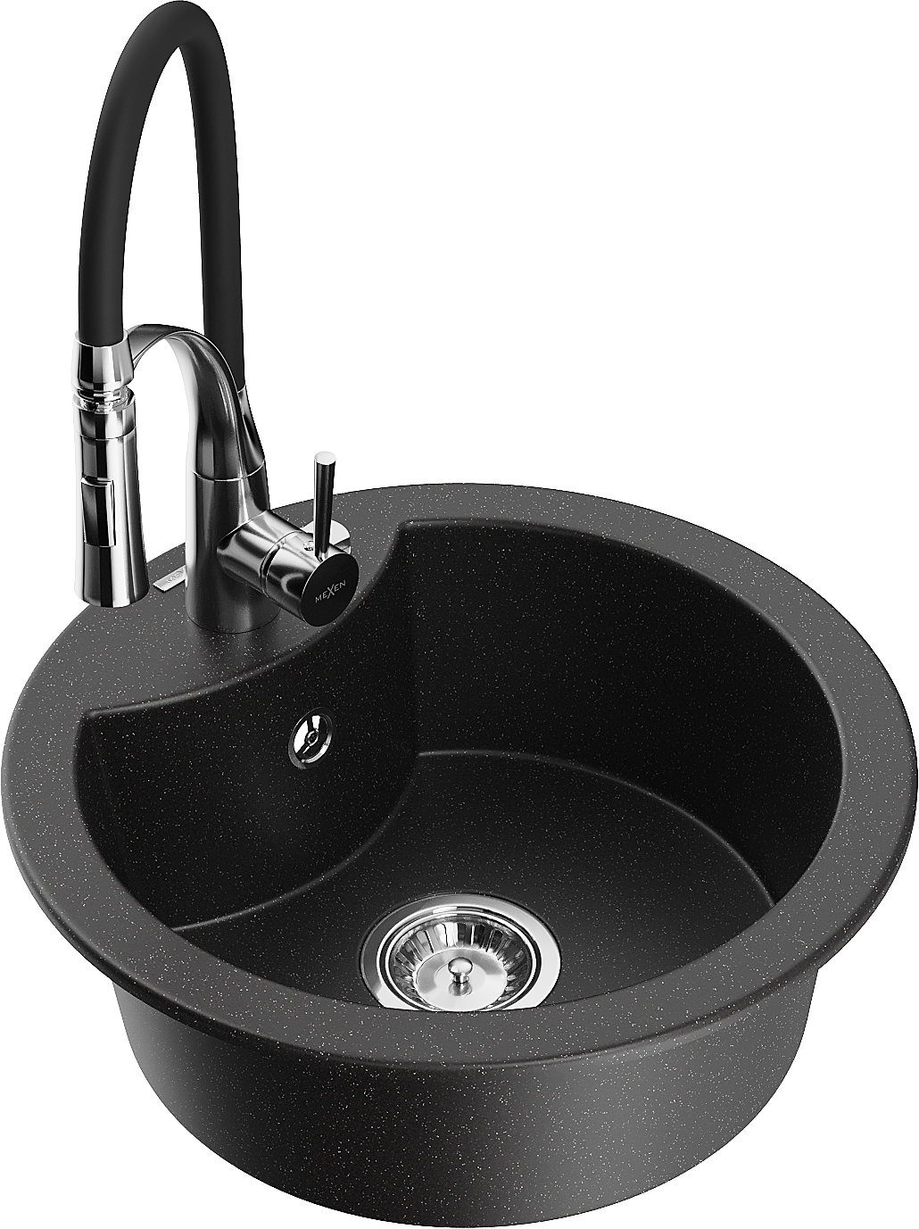 Mexen Diego гранитна кухненска мивка с една камера и кухненски смесител Aster, черен/сребрист металик - 6512-73-73450-07
