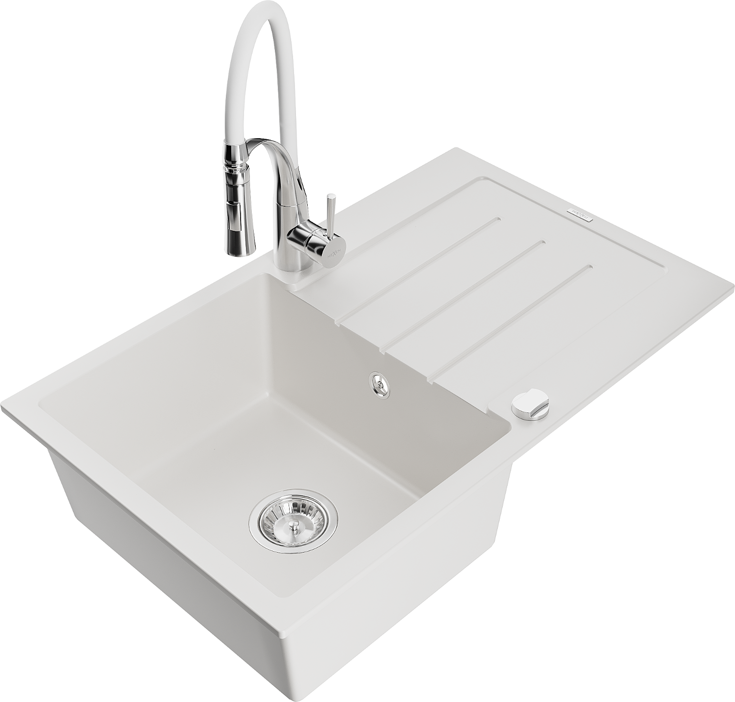 Mexen Bruno гранитна мивка 1-камерна с отцедник и кухненски смесител Aster, бял - 6513-20-73450-02