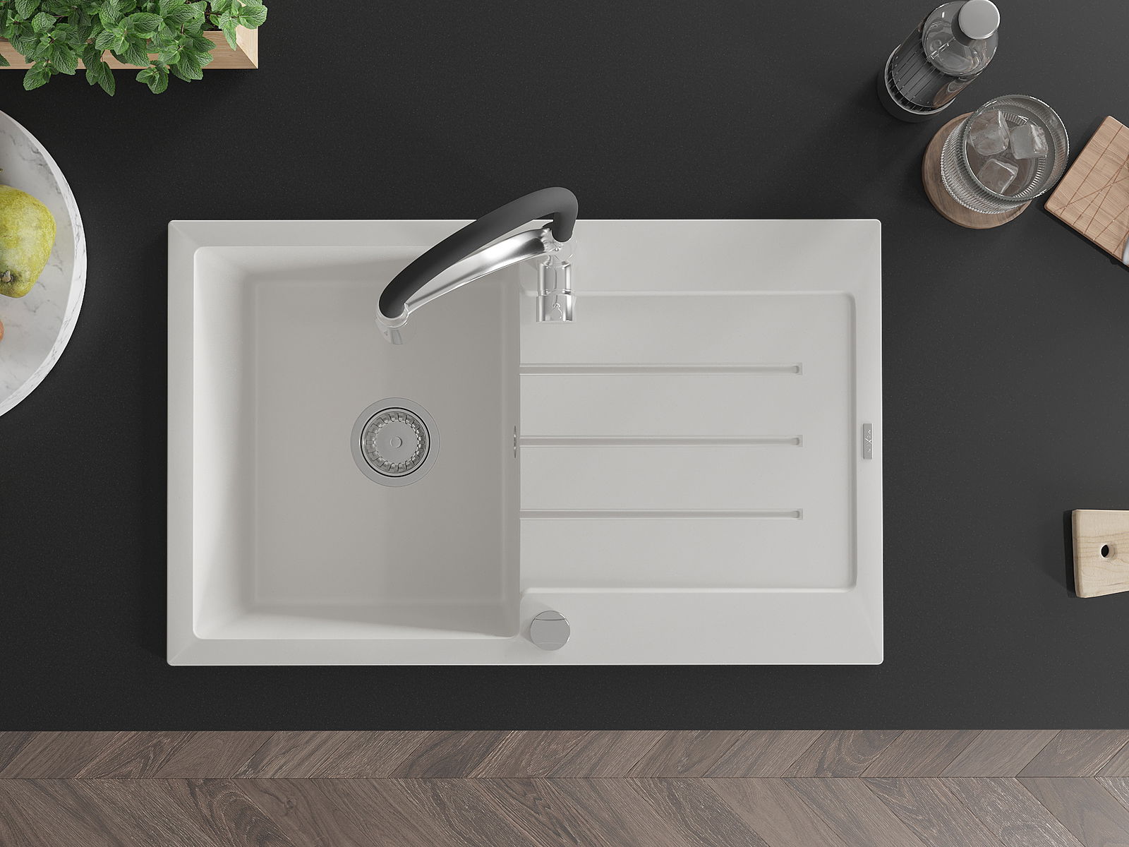 Mexen Bruno гранитна мивка с 1 отделение с отцедник и кухненски смесител Aster, бял - 6513-20-73450-07