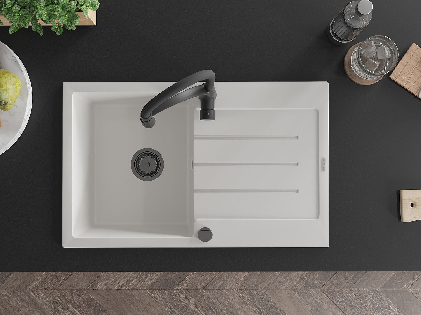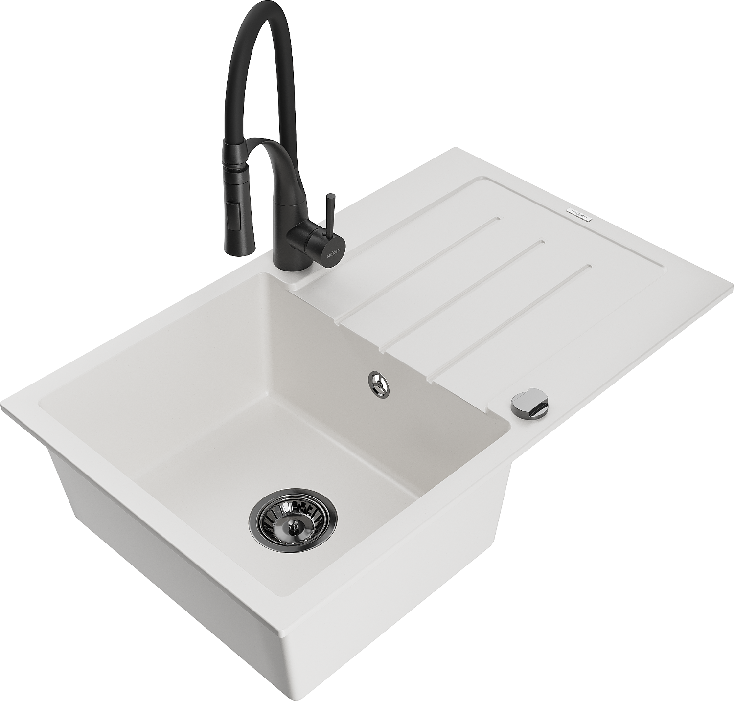 Mexen Bruno гранитна мивка с 1 отделение с отцедник и кухненски смесител Aster, бял - 6513-20-73450-70-B