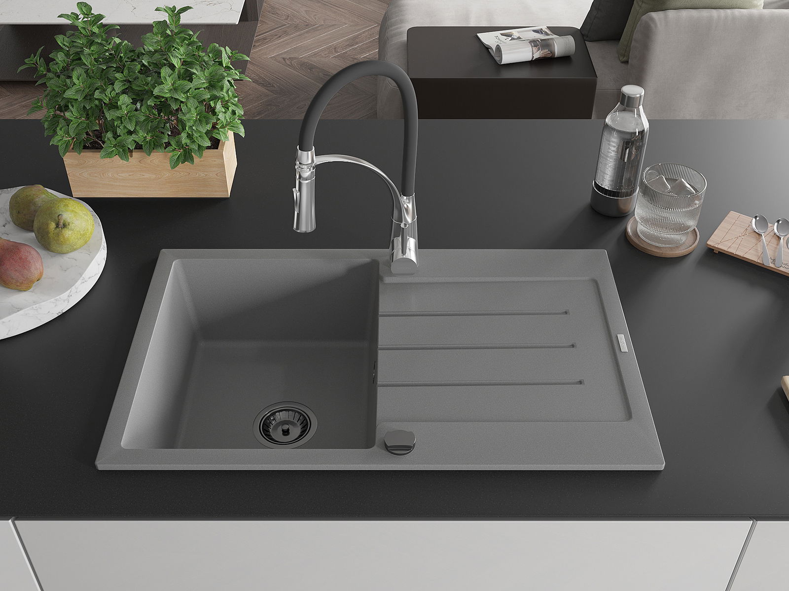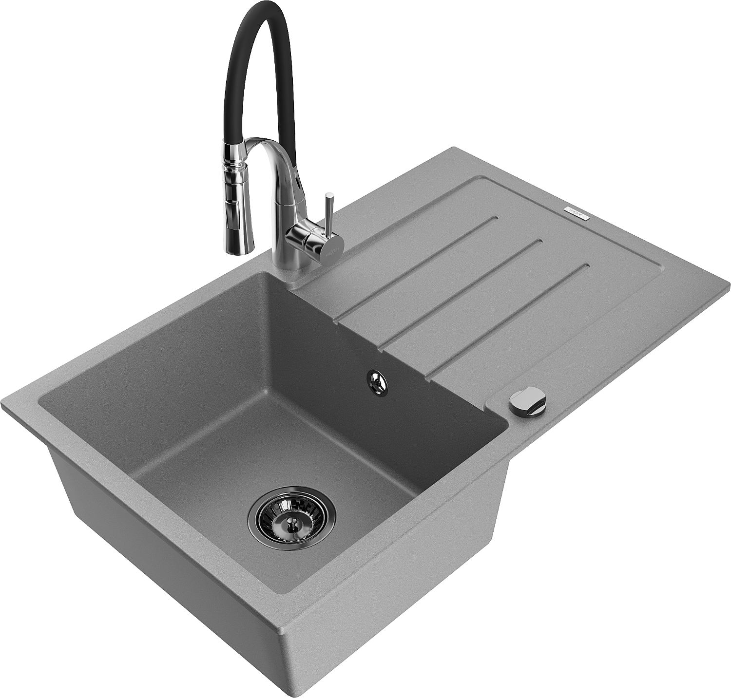 Mexen Bruno еднокоморна гранитна мивка със сушилник и кухненски смесител Aster, сив - 6513-71-73450-07-B