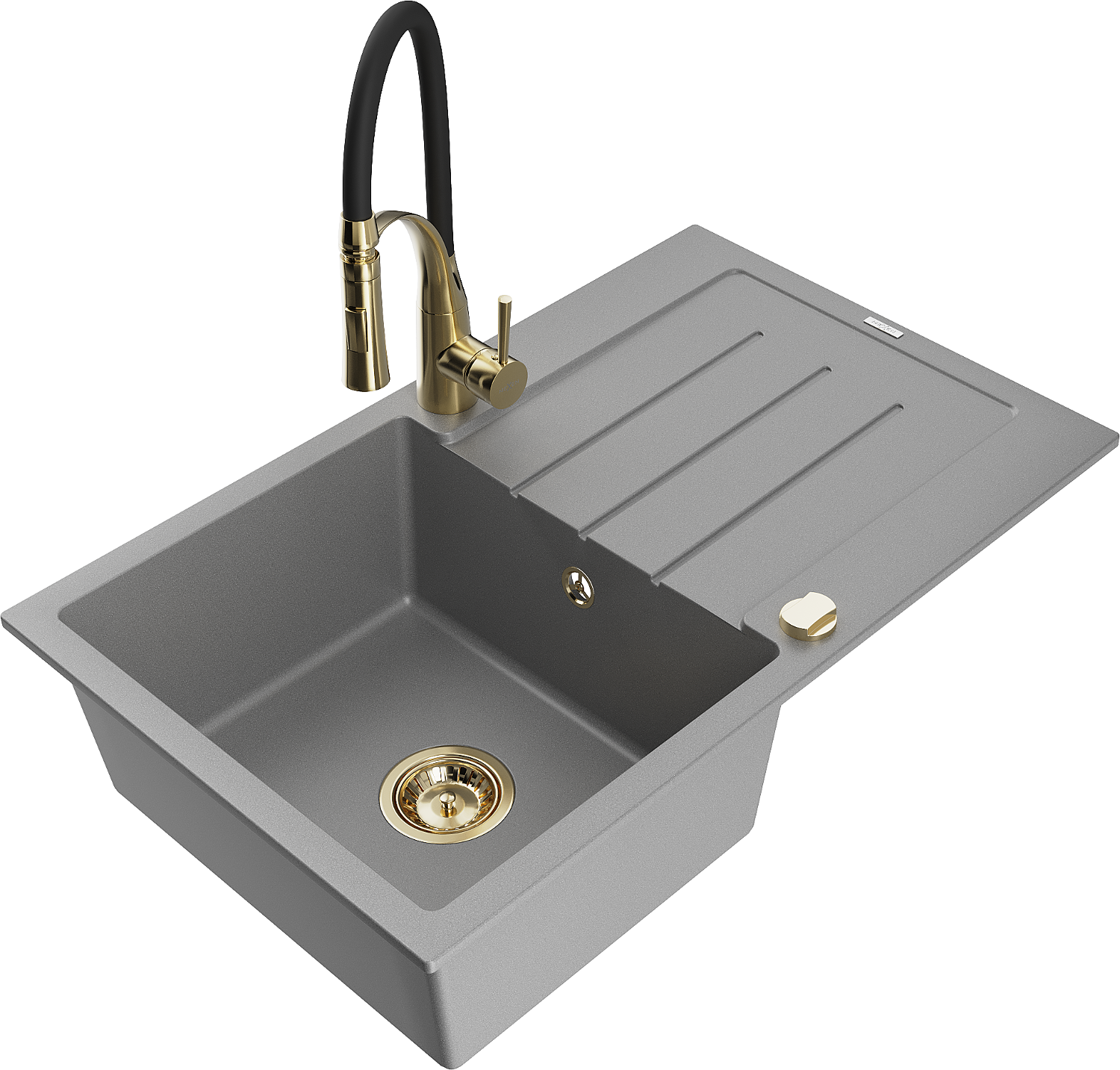 Mexen Bruno гранитна мивка с 1 отделение с отцедник и кухненски смесител Aster, сив - 6513-71-73450-57-G