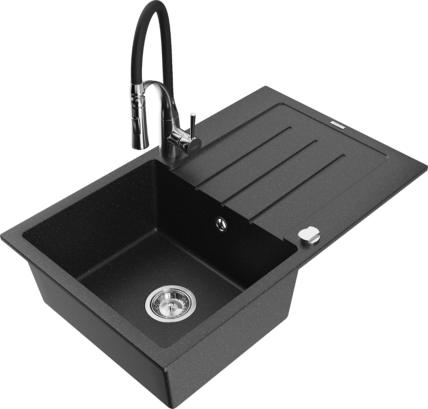 Mexen Bruno гранитна мивка с 1 отделение с оцедник и кухненски смесител Aster, черен/сребърен металик - 6513-73-73450-07