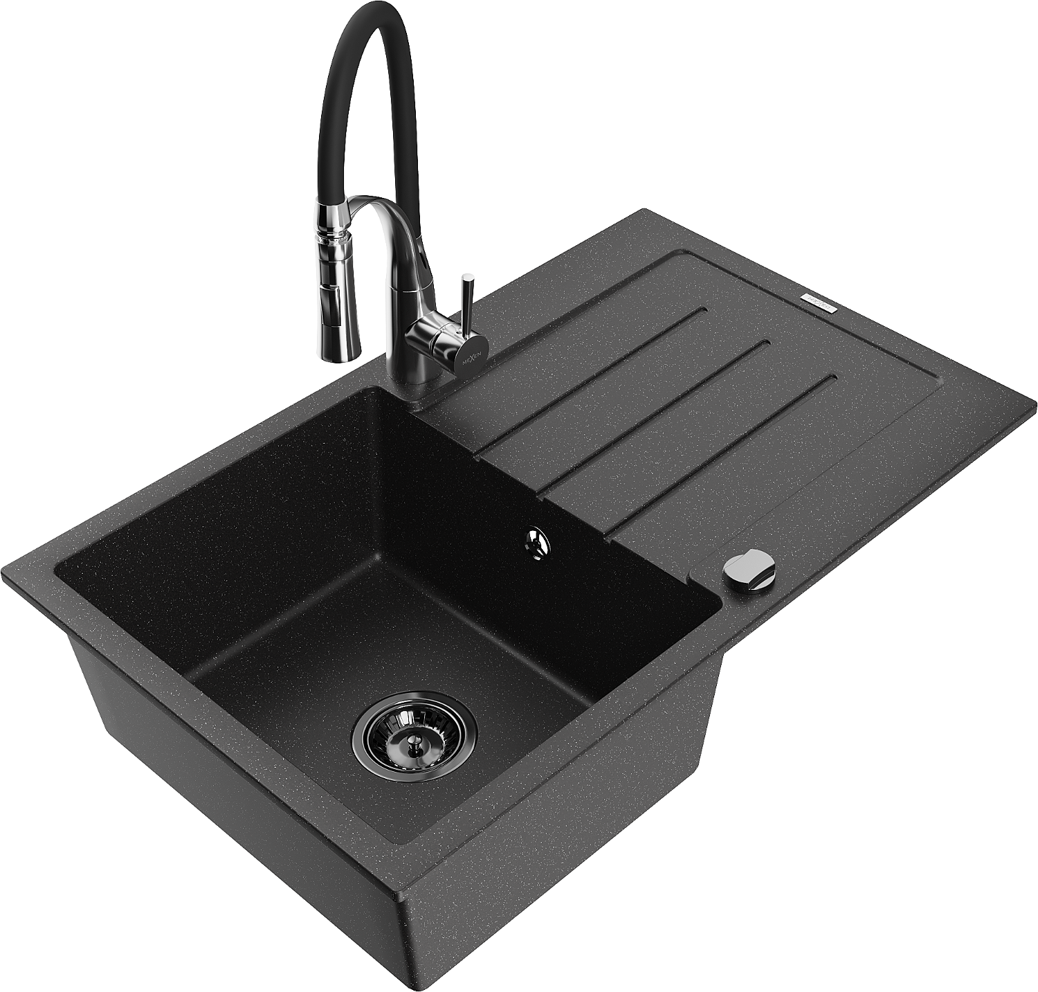 Mexen Bruno гранитна мивка 1-камерна с отцедник и кухненски смесител Aster, черен/сребърен металик - 6513-73-73450-07-B