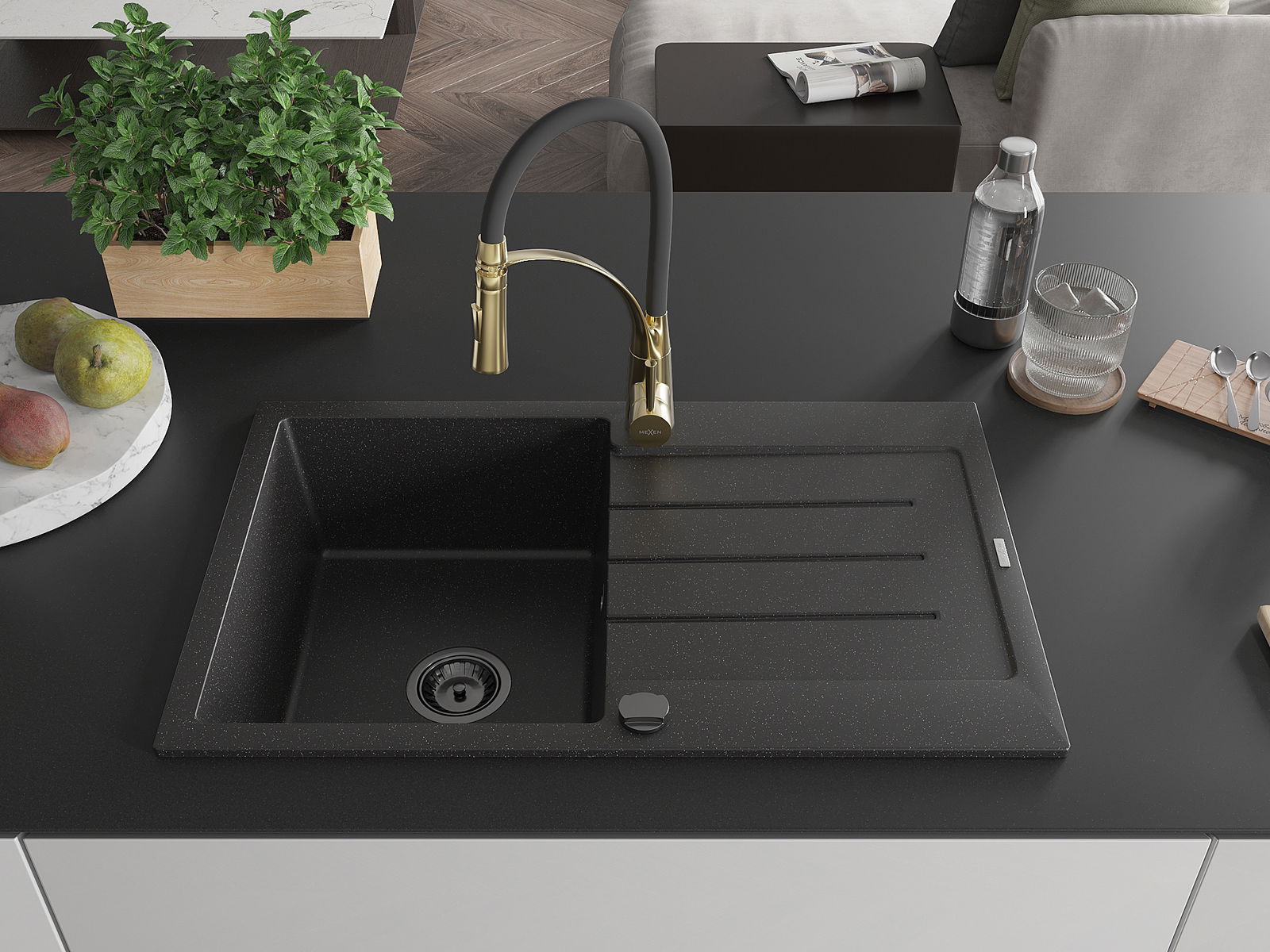 Mexen Bruno гранитна мивка с 1 корито с отцедник и кухненски смесител Aster, черен/сребрист металик - 6513-73-73450-57-B