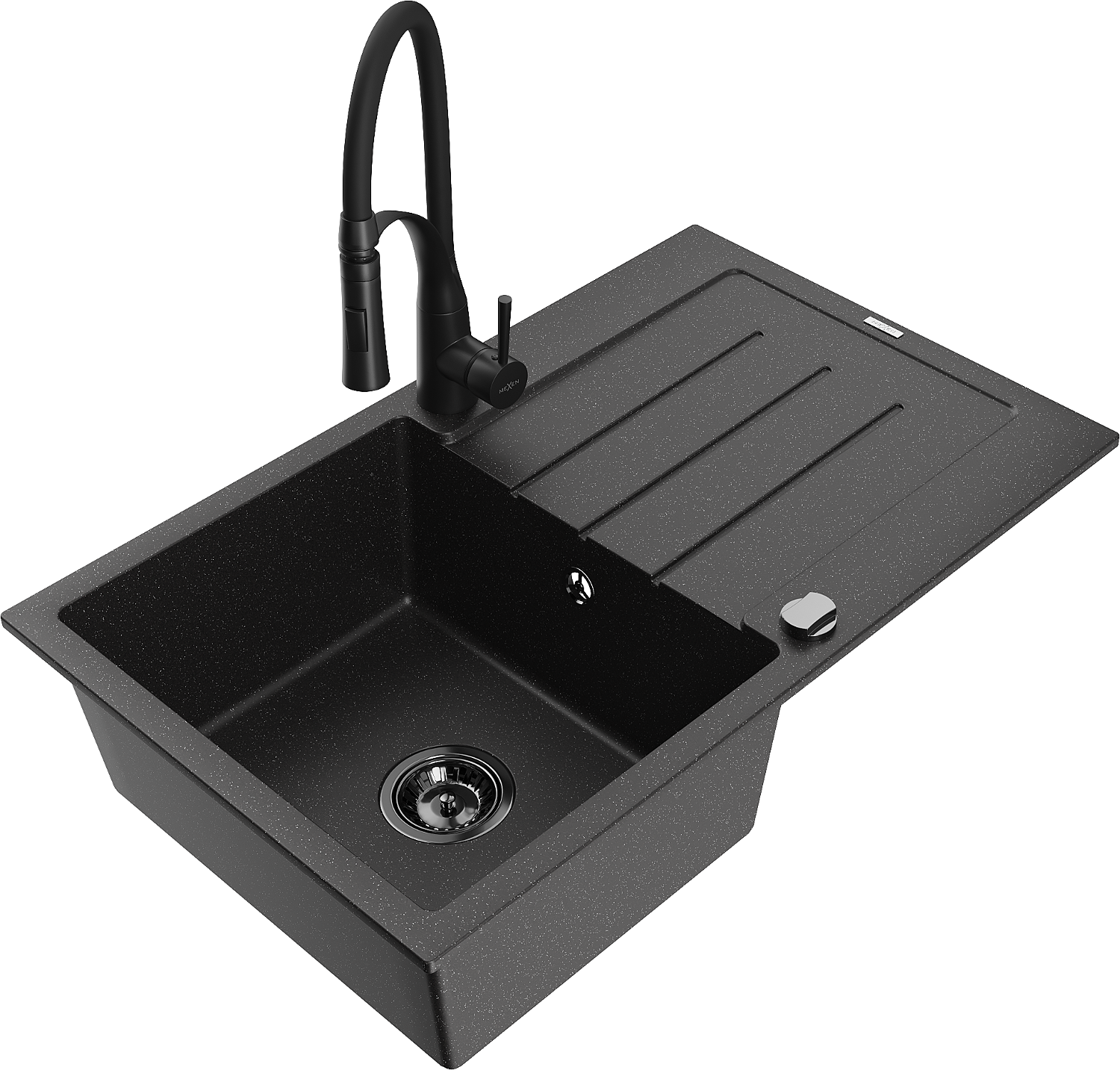 Mexen Bruno гранитна мивка с 1 отделение с плот и кухненски смесител Aster, черно/сребрист металик - 6513-73-73450-70-B