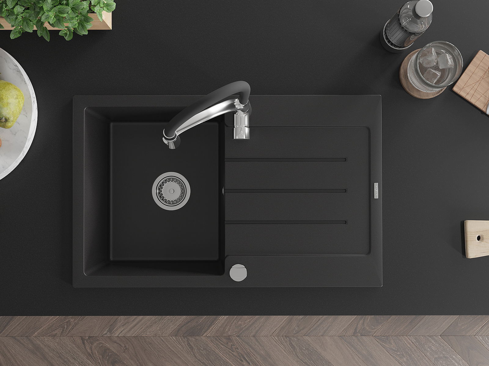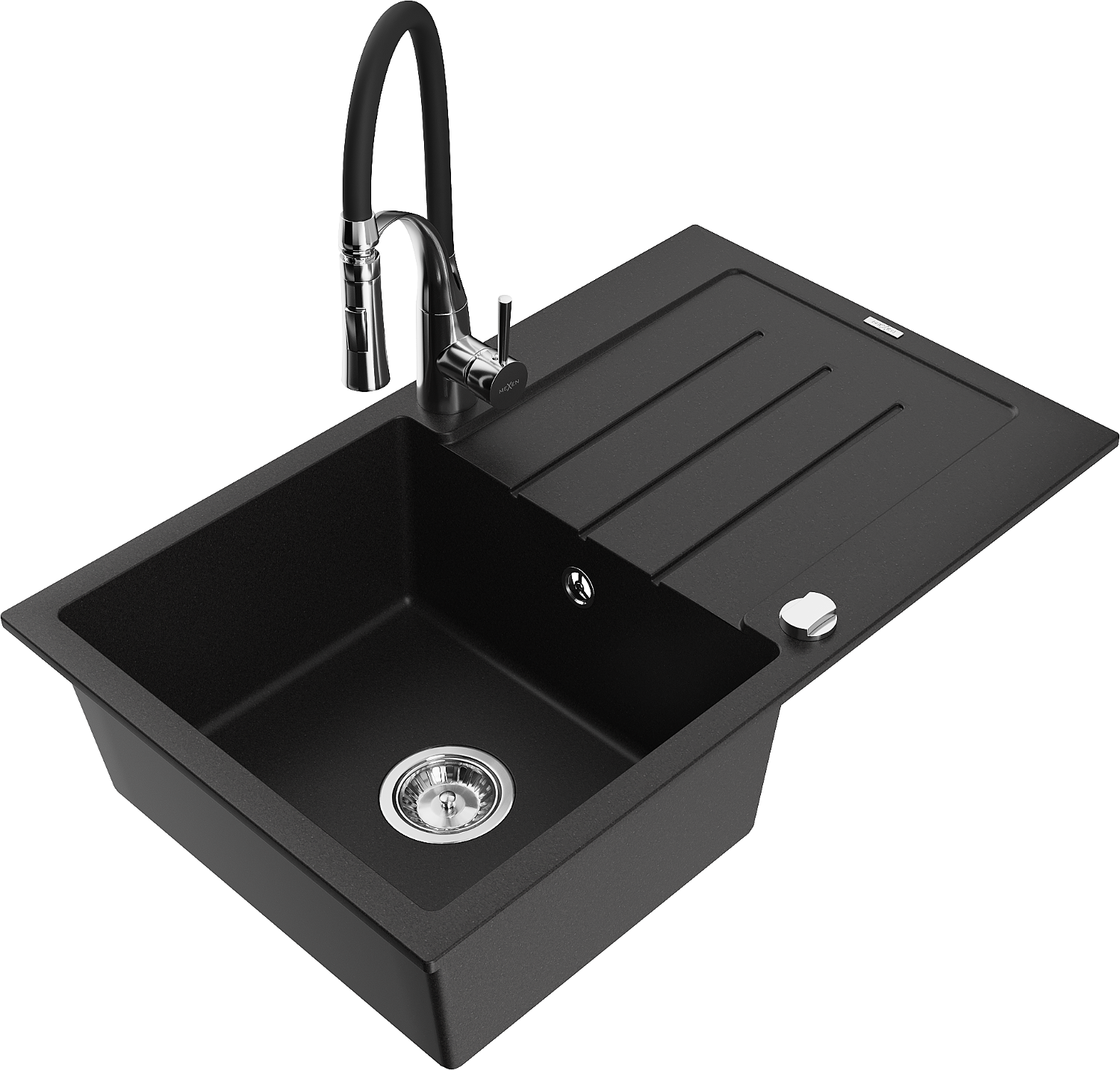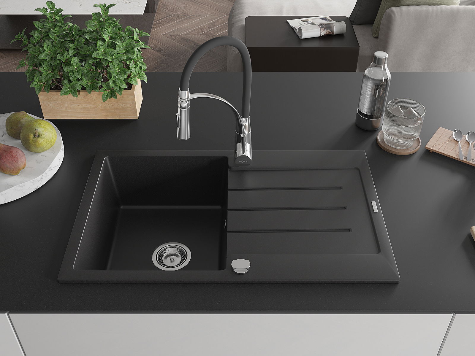 Mexen Bruno гранитна кухненска мивка с 1 корито и отцедник и кухненски смесител Aster, черен - 6513-77-73450-07