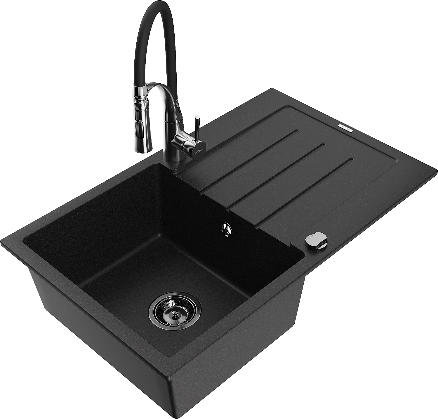Mexen Bruno гранитна кухненска мивка с 1 корито с отцедник и кухненски смесител Aster, черен - 6513-77-73450-07-B