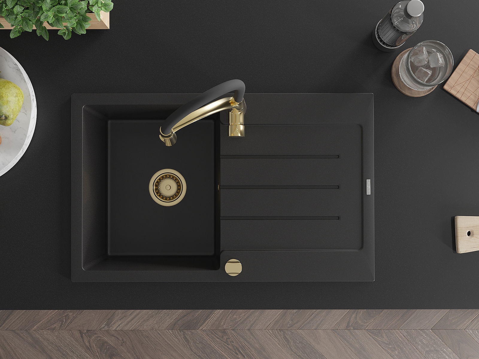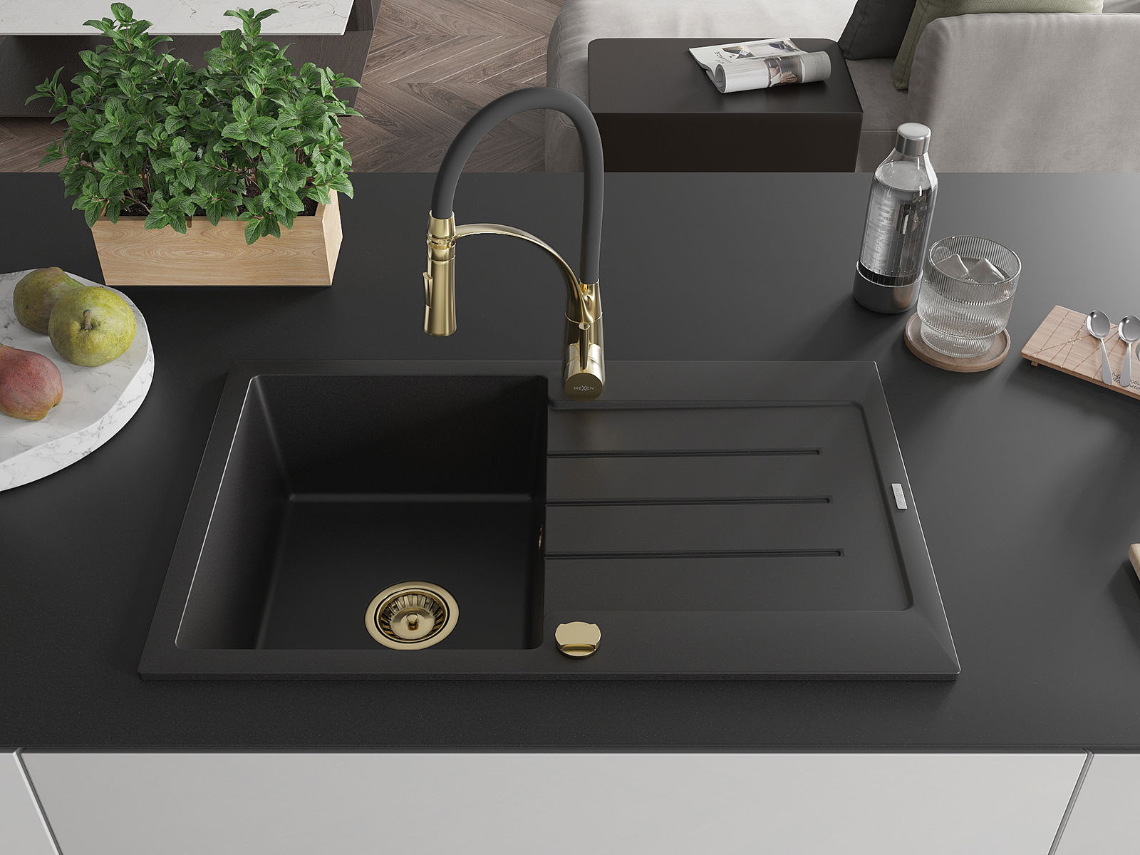 Mexen Bruno гранитна мивка с 1 камера с отцедник и кухненски смесител Aster, черен - 6513-77-73450-57-G