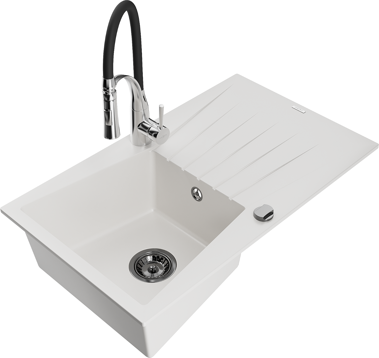 Mexen Cesar гранитна мивка с 1 отделение и дренаж и кухненски смесител Aster, бял - 6514-20-73450-07-B