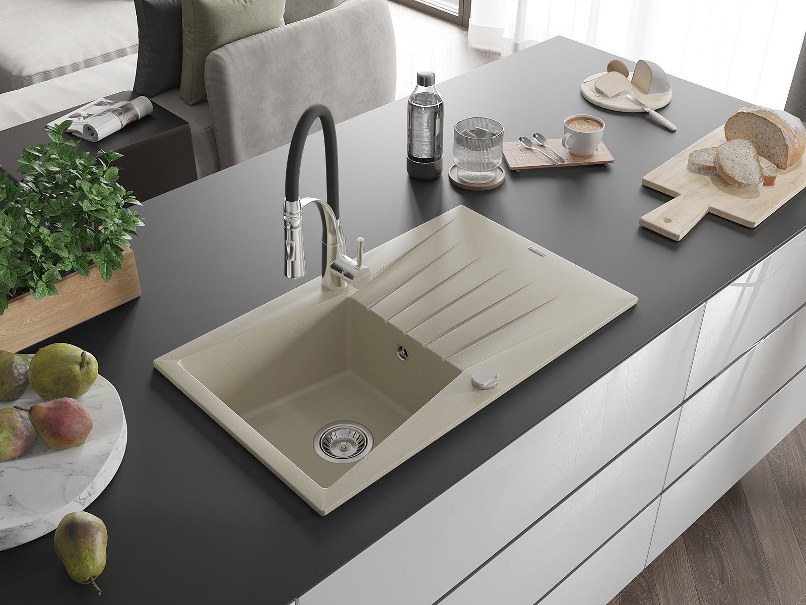 Мивката е направена от висококачествен гранит. Това е елегантно и най -вече практично допълнение към всяка кухня, независимо от нейния стил. Висококачествената и гранитна издръжливост осигуряват много години употреба.