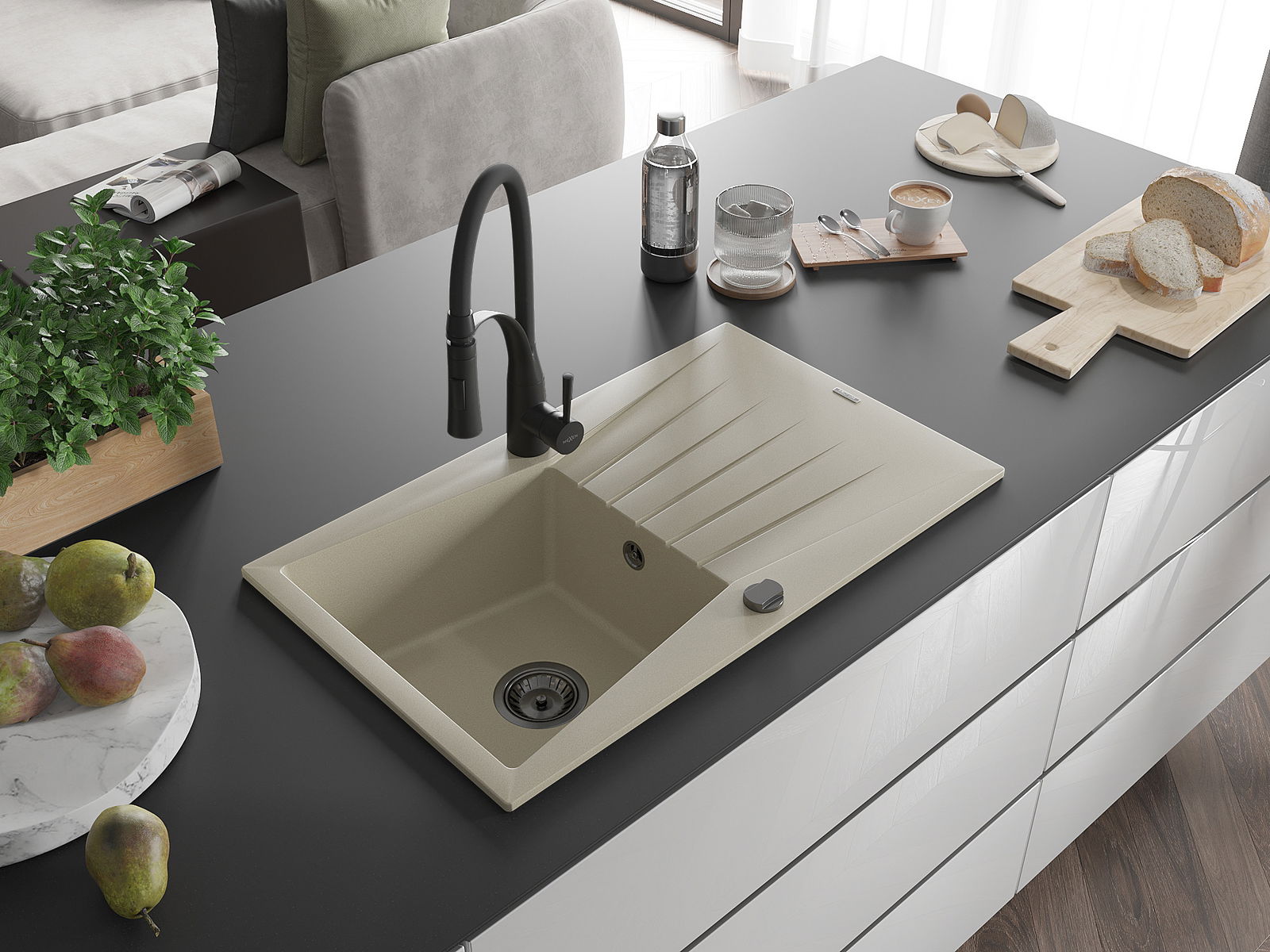 Мивката е направена от висококачествен гранит. Това е елегантно и най -вече практично допълнение към всяка кухня, независимо от нейния стил. Висококачествената и гранитна издръжливост осигуряват много години употреба.