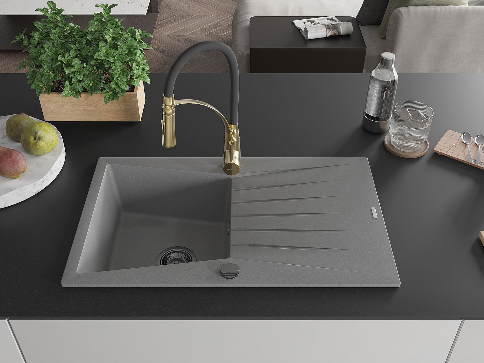 Mexen Cesar гранитна мивка с 1 отделение с отцедник и кухненски кран Aster, сив - 6514-71-73450-57-B