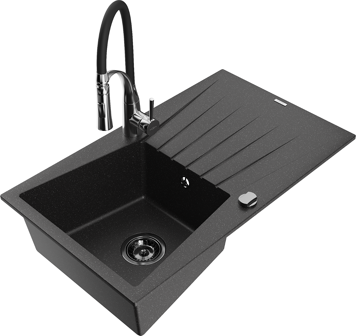 Гранитна мивка Mexen Cesar с 1 отделение, отцеждач и кухненски смесител Aster, черен/сребрист металик - 6514-73-73450-07-B