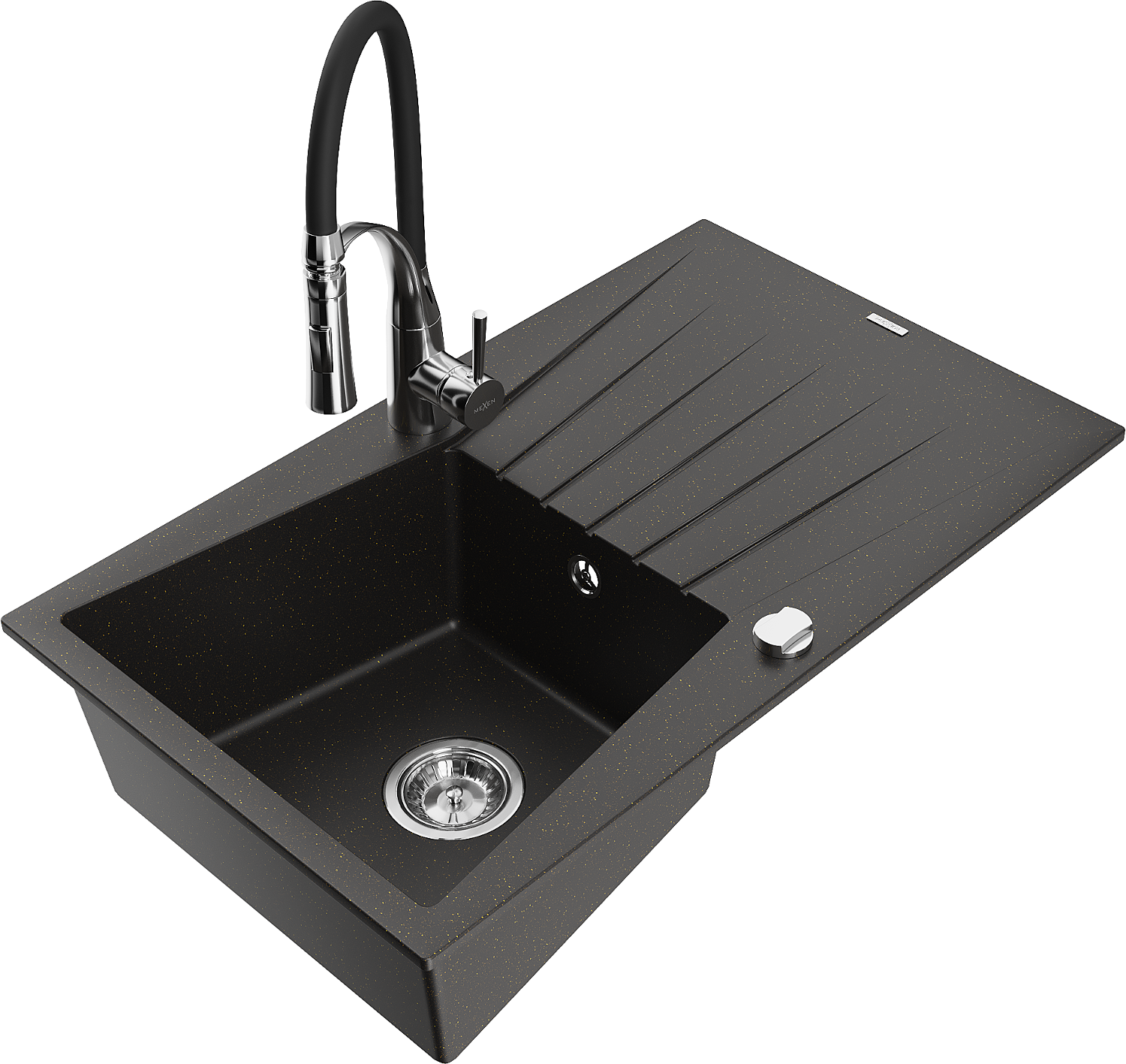 Мекшен Цезар гранитна мивка с 1 камера с отцедник и кухненски смесител Астер, черен/златен металик - 6514-75-73450-07
