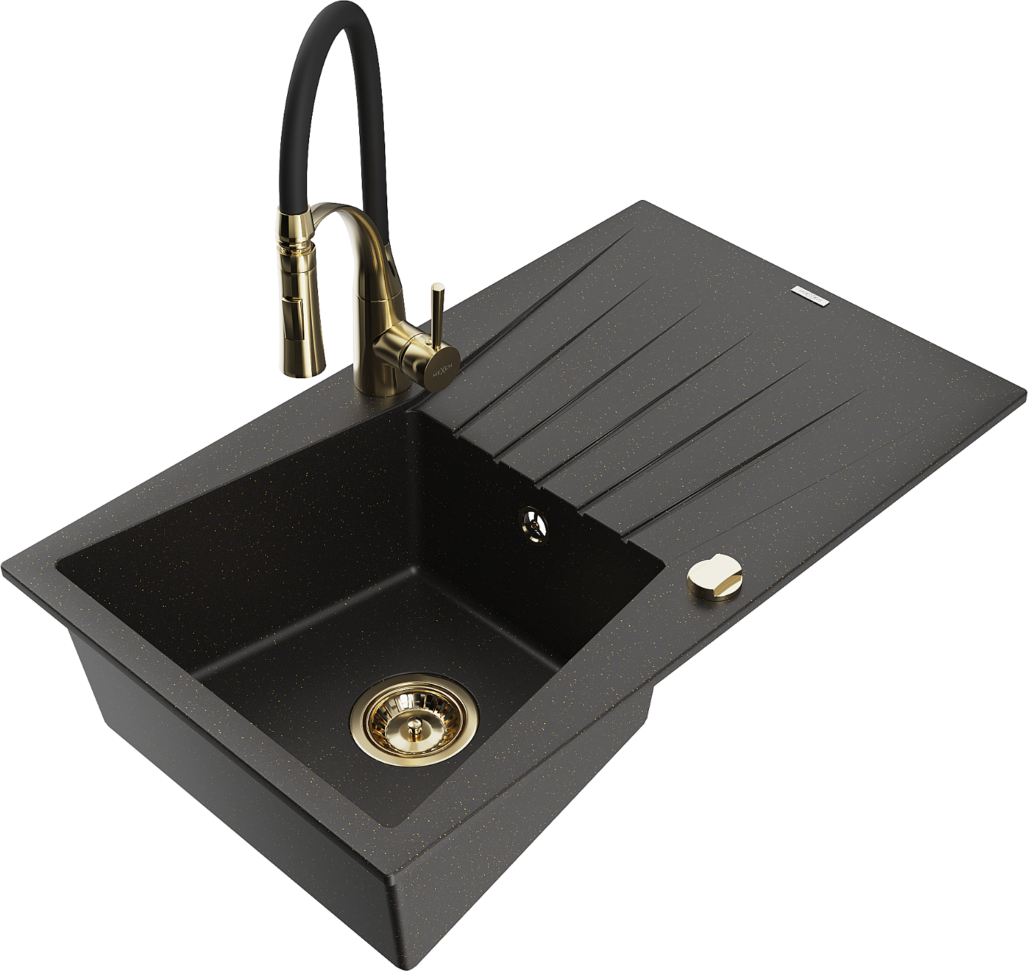 Mexen Cesar гранитна мивка с 1 отделение със сушилня и кухненски смесител Aster, черен/златен металик - 6514-75-73450-57-G