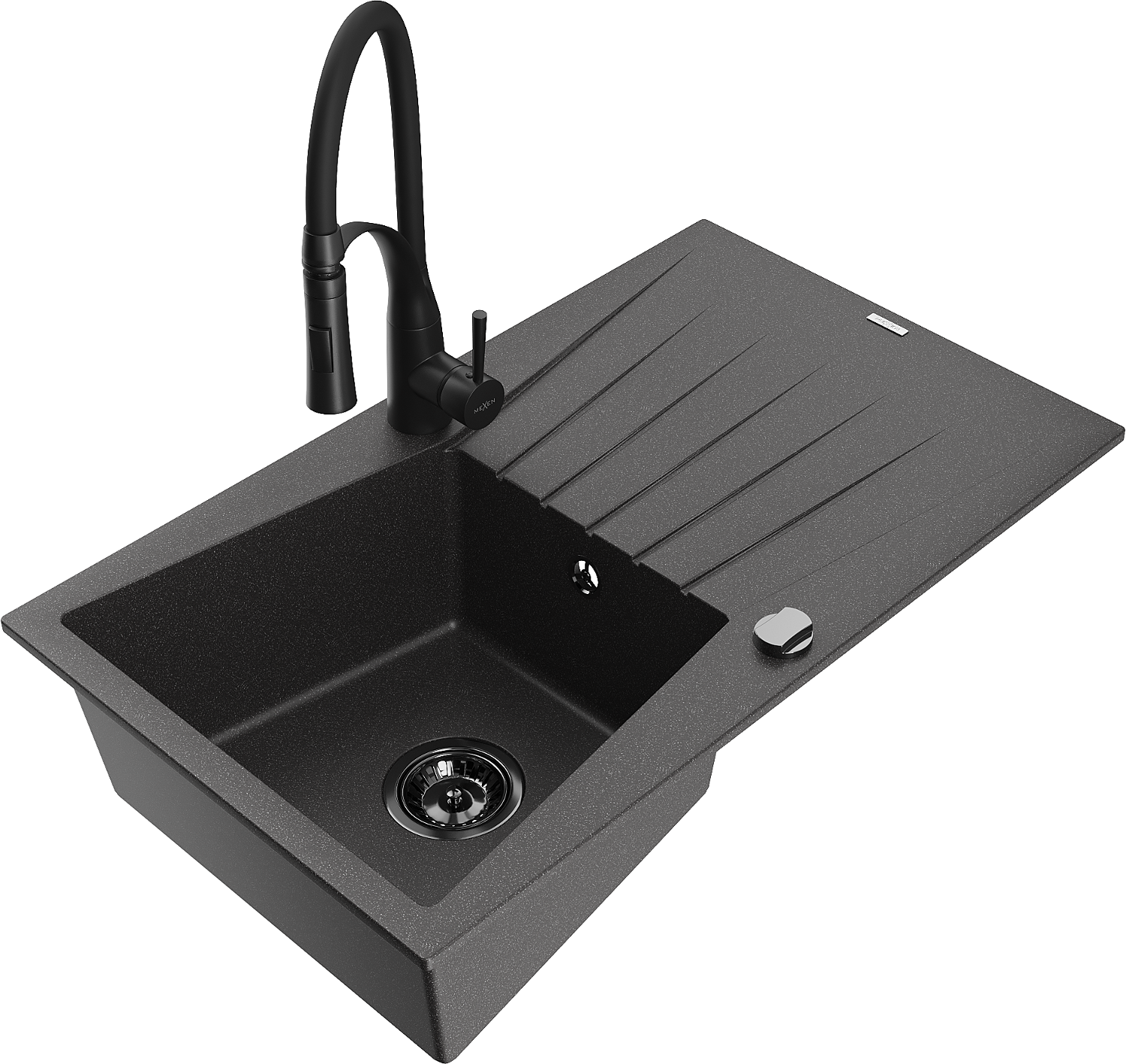 Mexen Cesar гранитна мивка 1-камерна с отцедник и кухненски смесител Aster, черно на пръски - 6514-76-73450-70-B