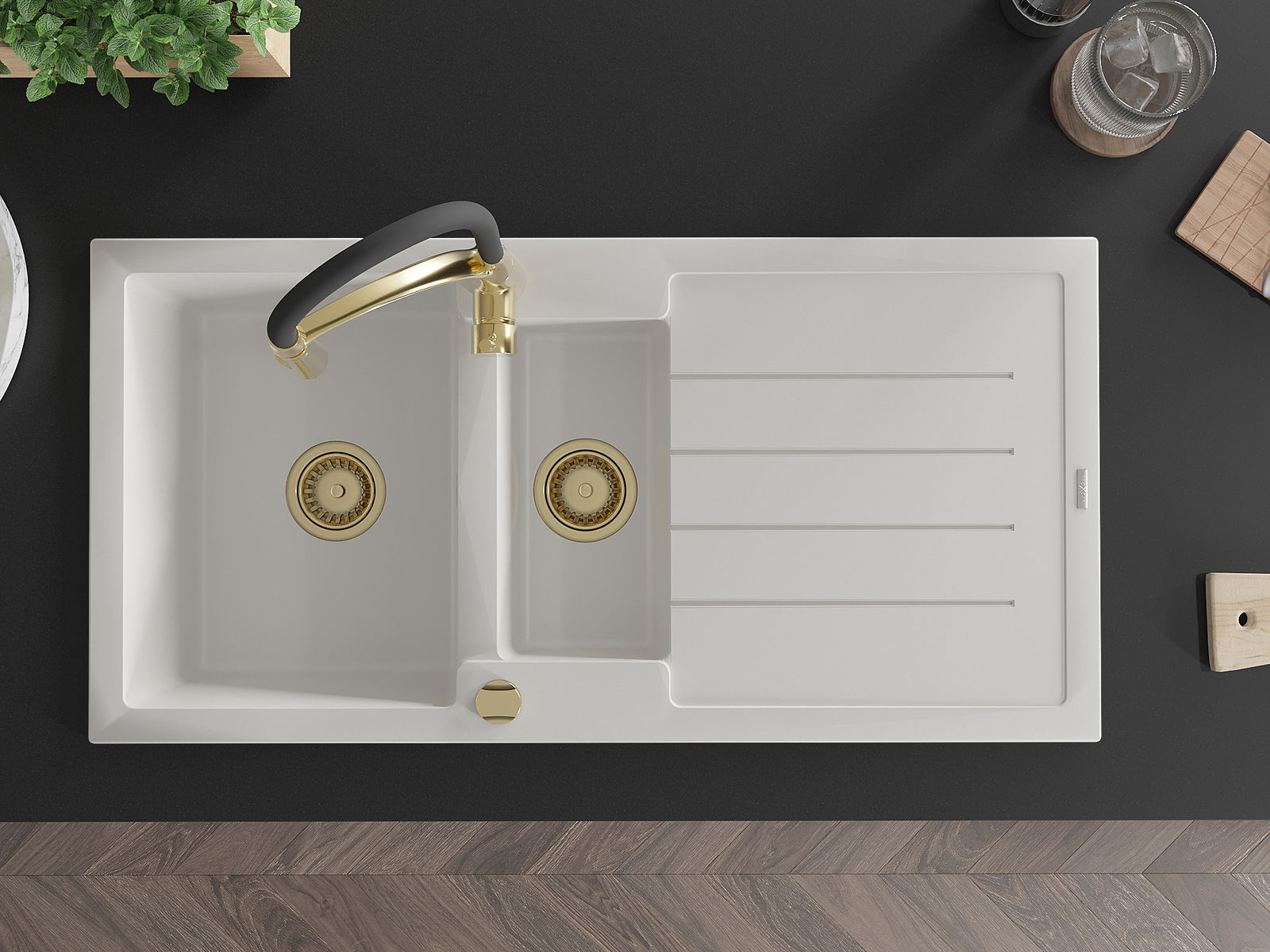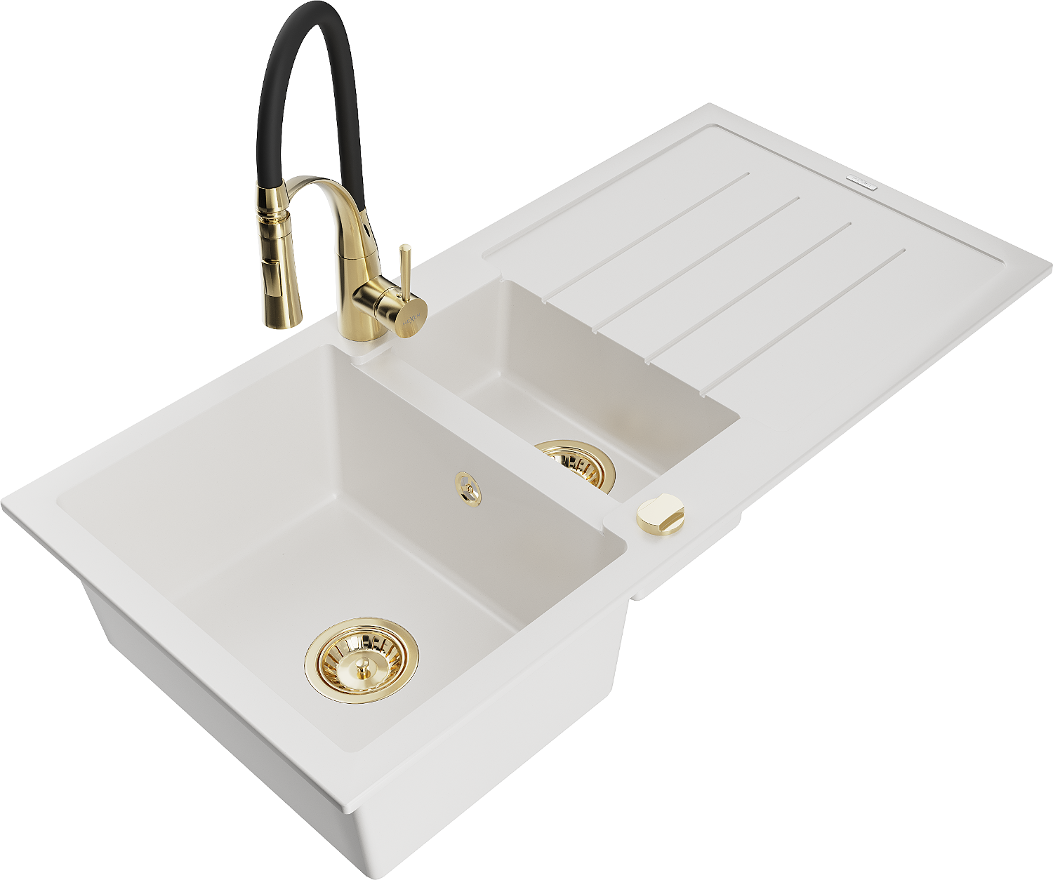 Mexen Andres гранитна мивка 1,5-камерна с отцедник и кухненски смесител Aster, бял - 6515-20-73450-57-G