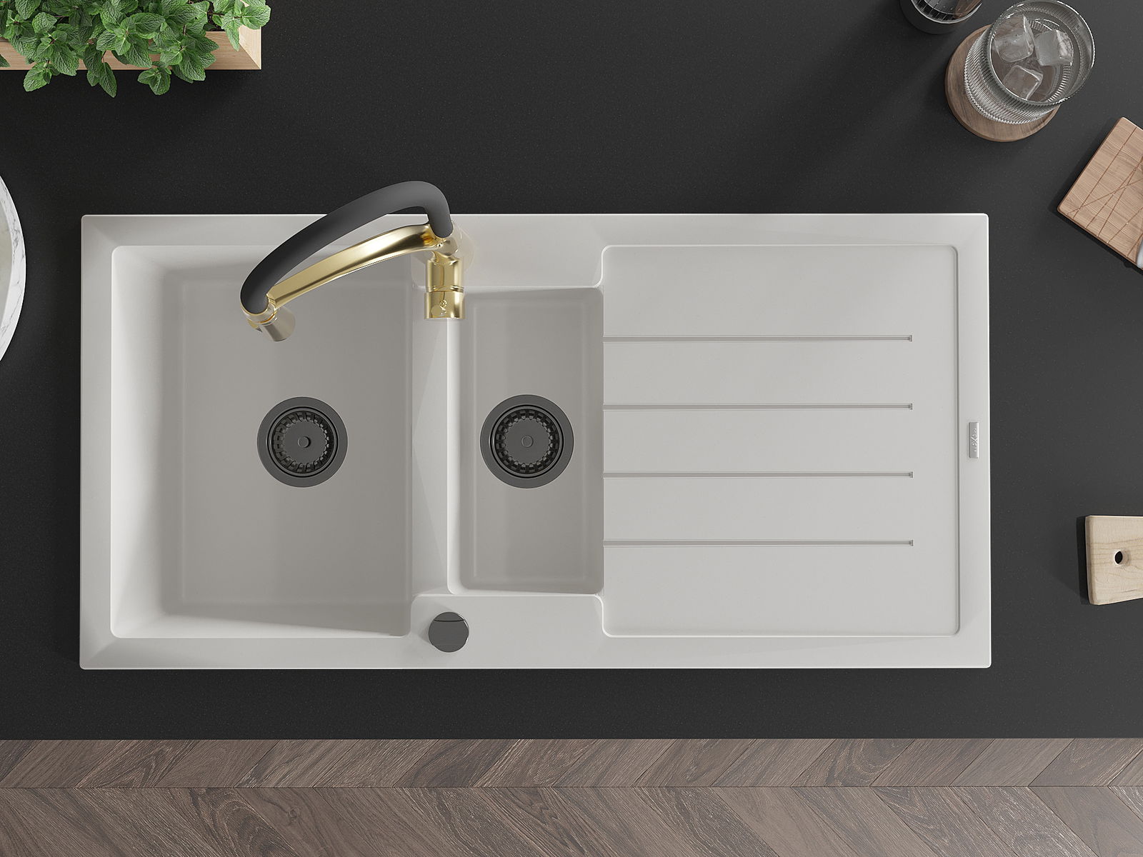 Mexen Andres гранитна мивка 1,5-коморна с отцедник и кухненски смесител Aster, бял - 6515-20-73450-57-B