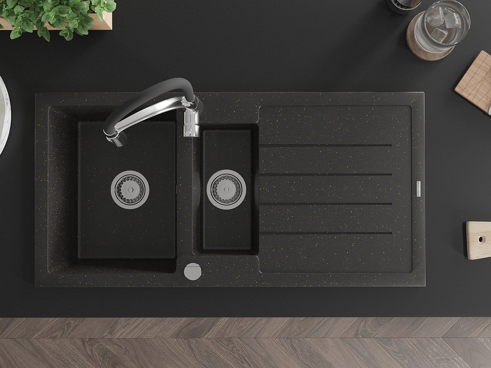 Mexen Andres гранитна мивка с 1,5 камери с отцедник и кухненски смесител Aster, черен/златен металик - 6515-75-73450-07
