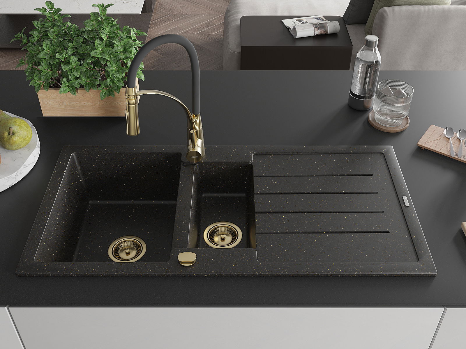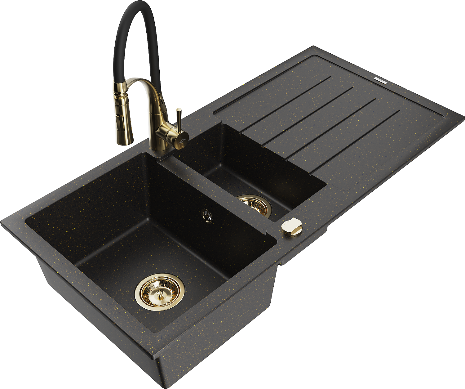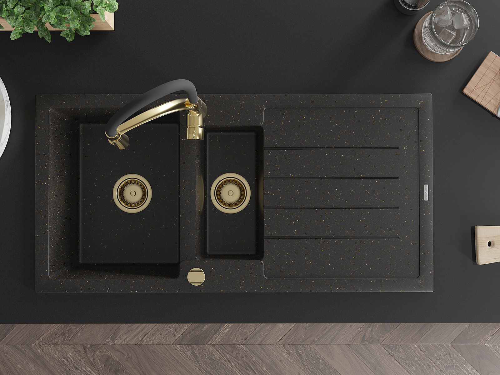 Mexen Andres гранитна мивка с 1,5 камери, с отцедник и кухненски смесител Aster, черен/златен металик - 6515-75-73450-57-G