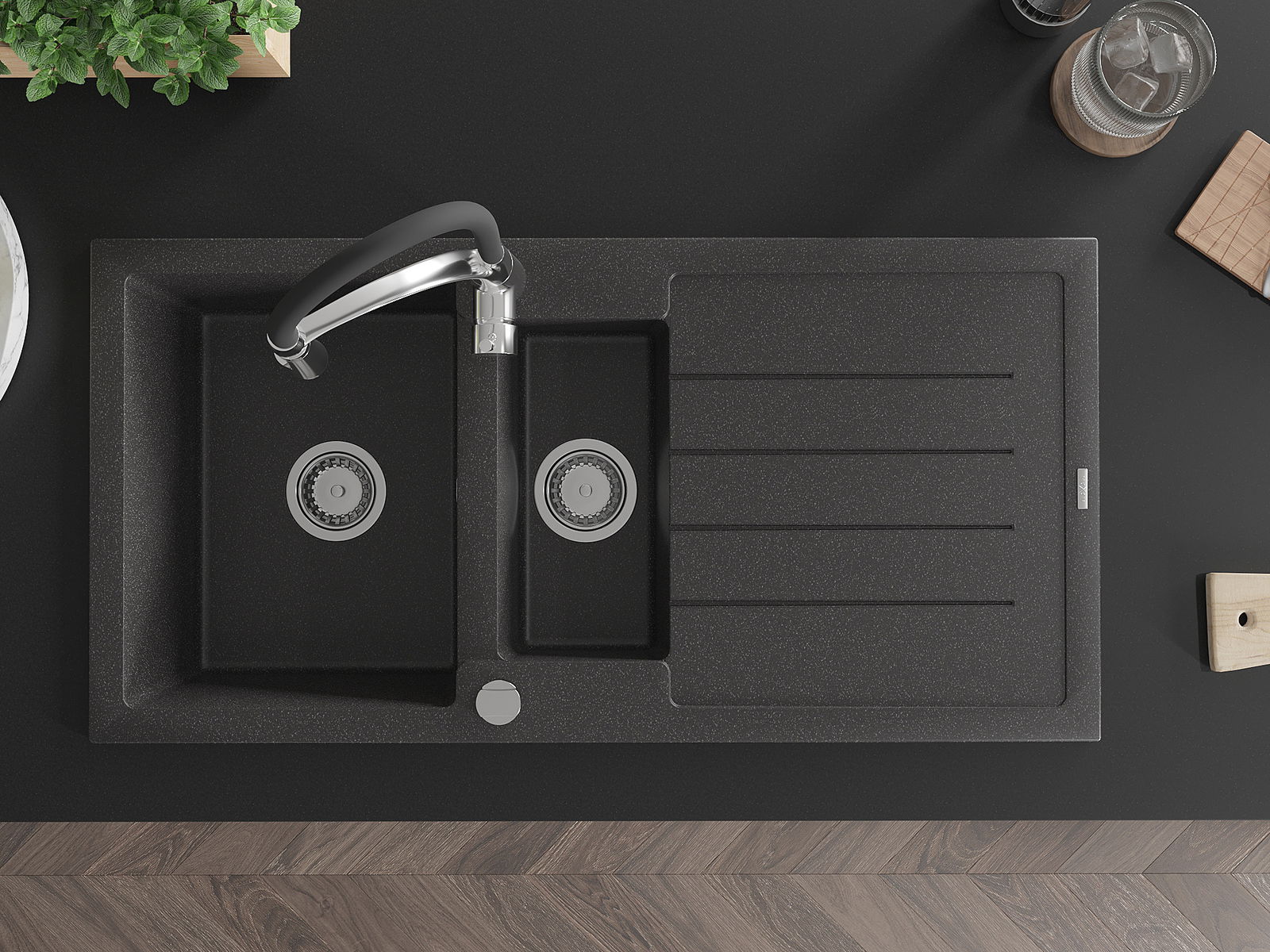 Mexen Andres - гранитна кухненска мивка 1,5 отделения с отцедник и кухненски смесител Aster, черен на пръски - 6515-76-73450-07