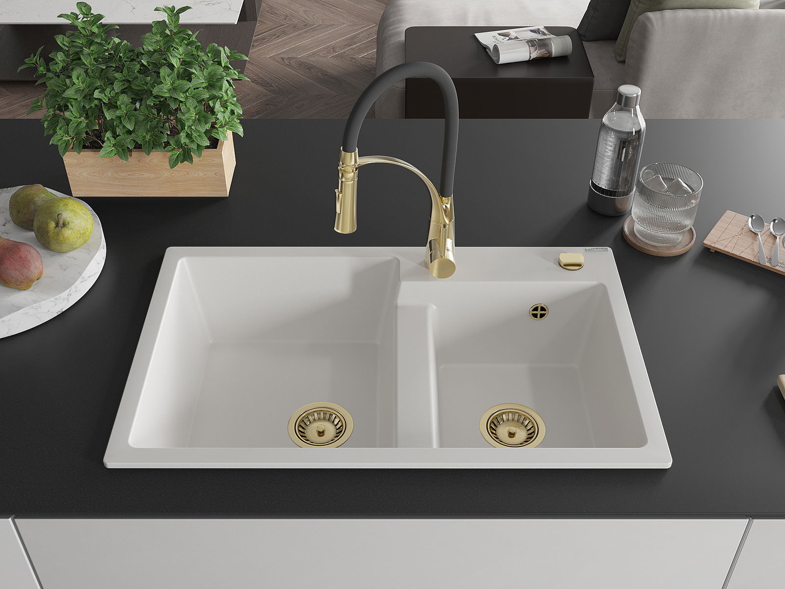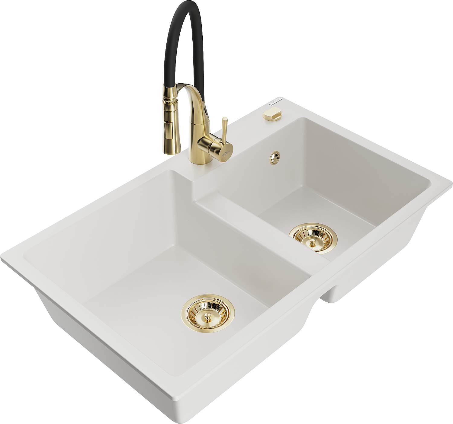 Mexen Tomas гранитна кухненска мивка с 2 камери и кухненски смесител Aster, бял - 6516-20-73450-57-G