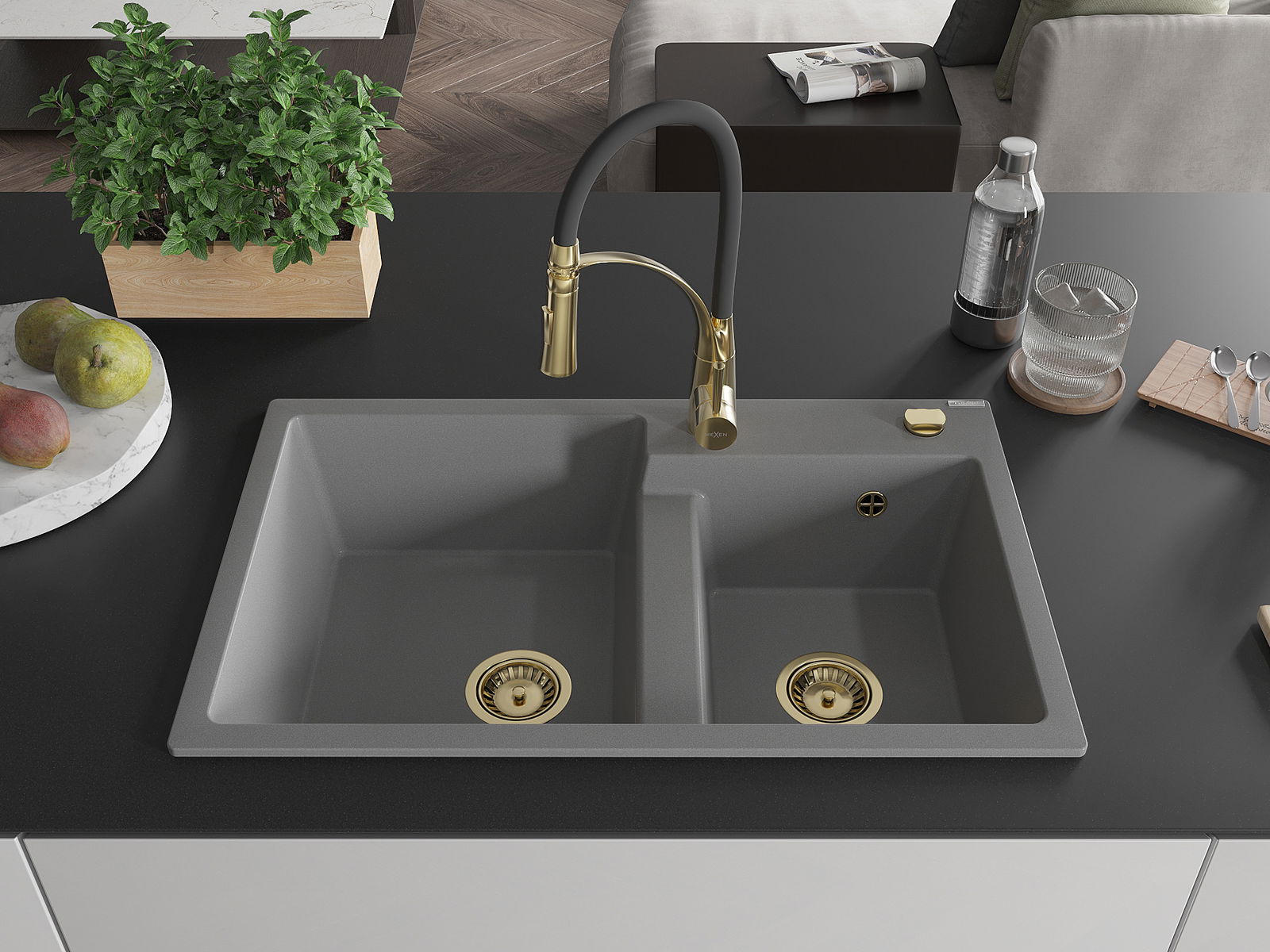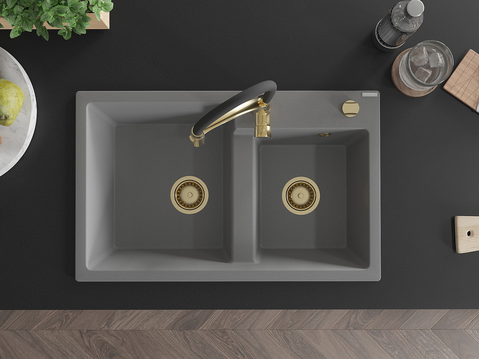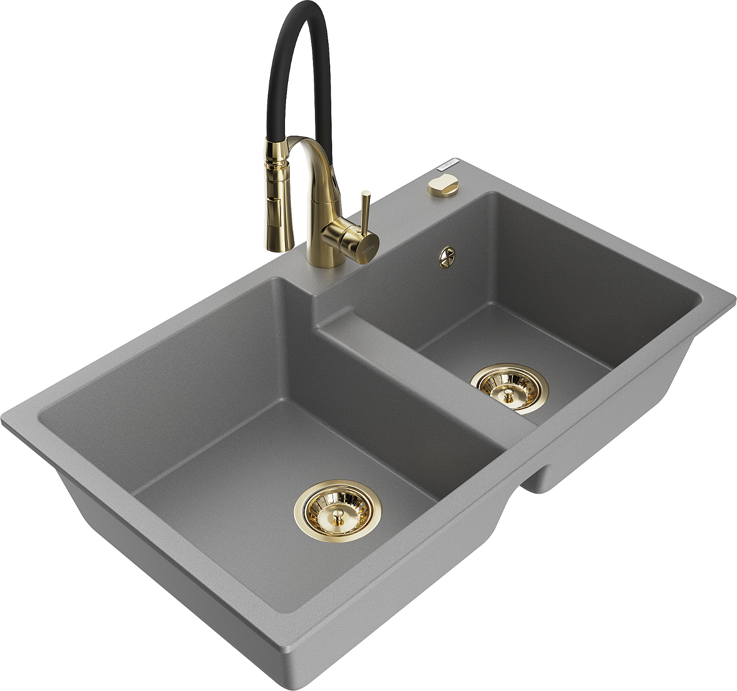 Mexen Tomas гранитна кухненска мивка с 2 камери и кухненски смесител Aster, сива - 6516-71-73450-57-G