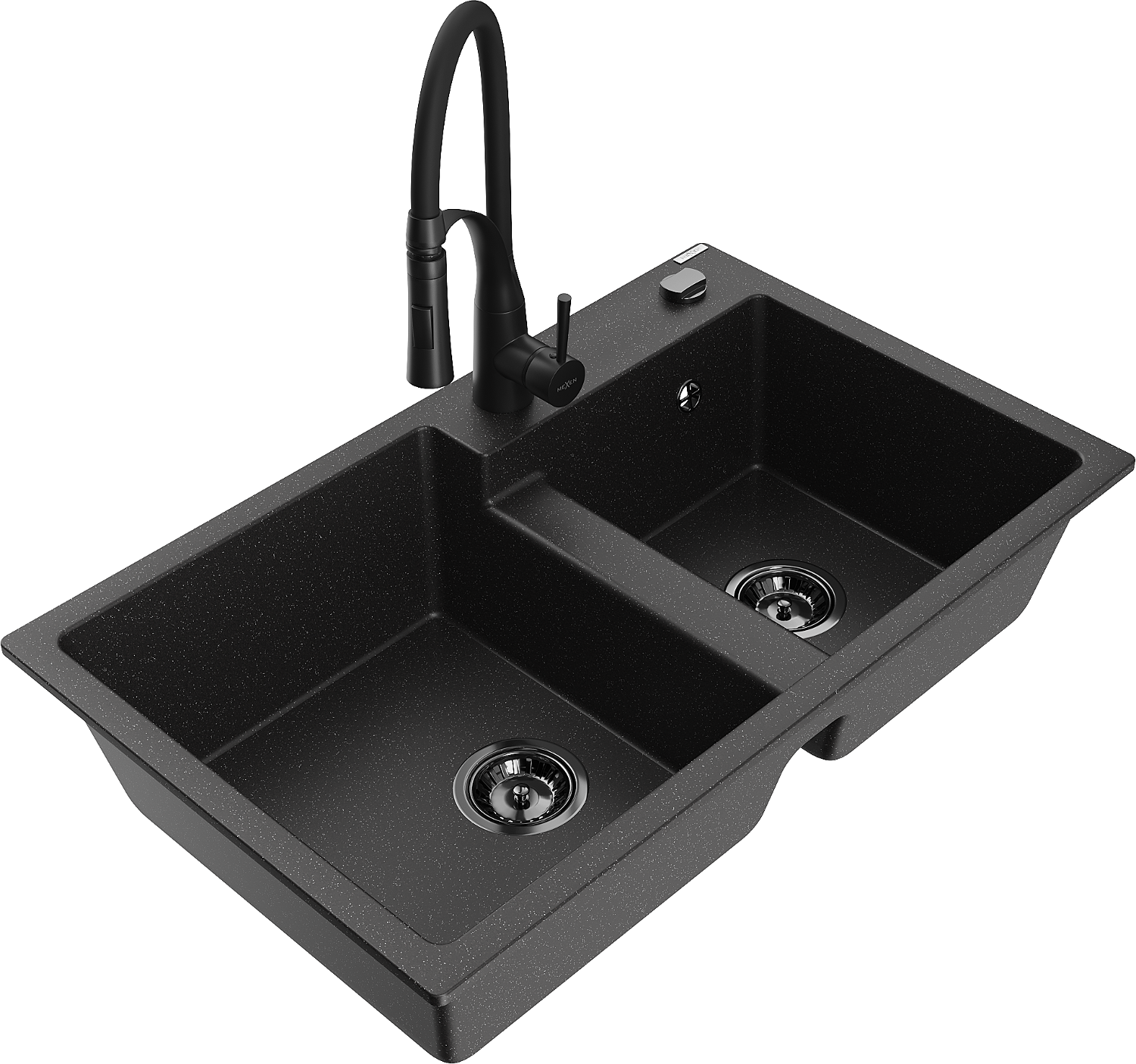 Mexen Tomas гранитна мивка с 2 отделения и кухненски смесител Aster, черно/сребърен металик - 6516-73-73450-70-B