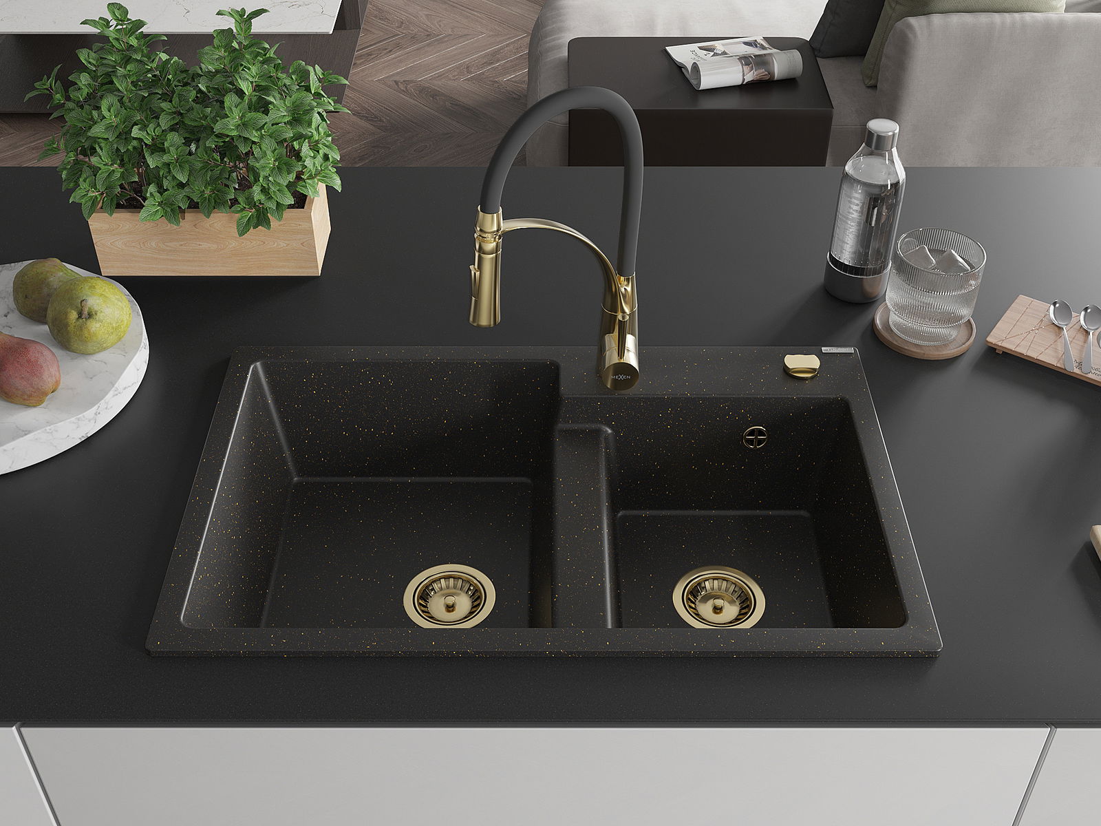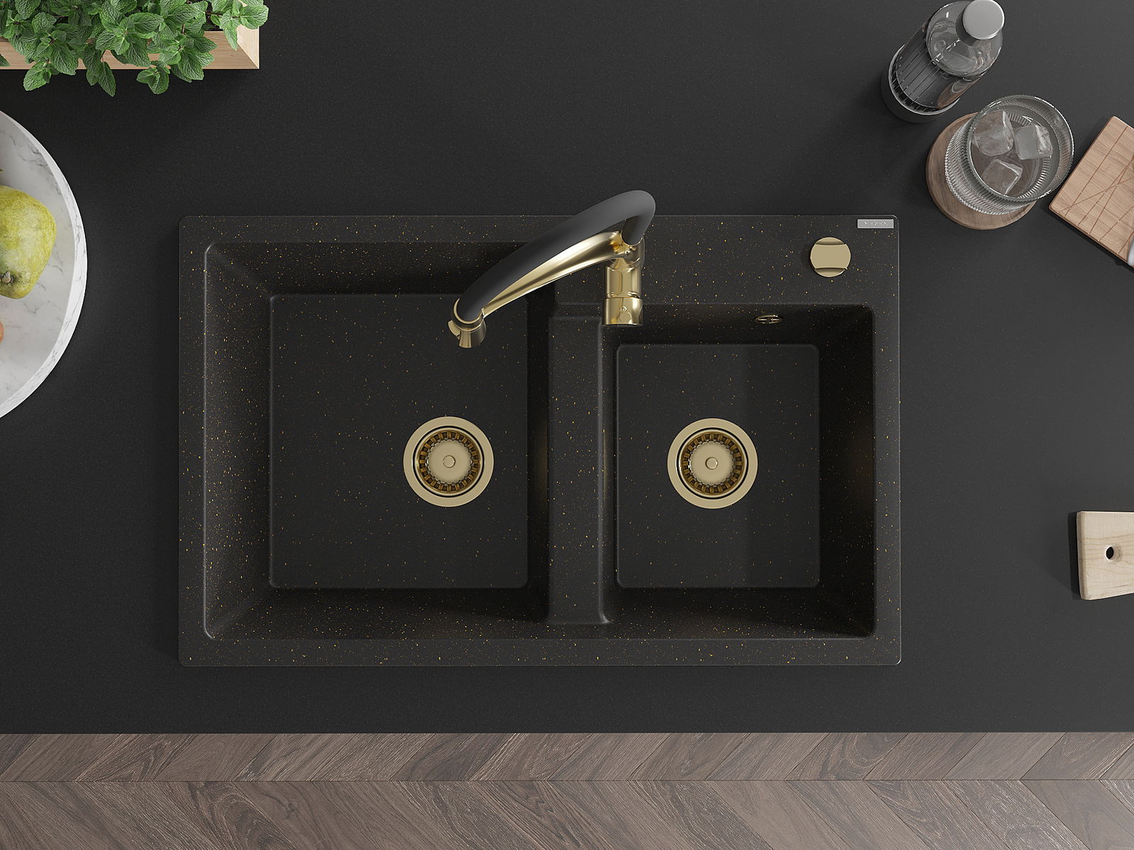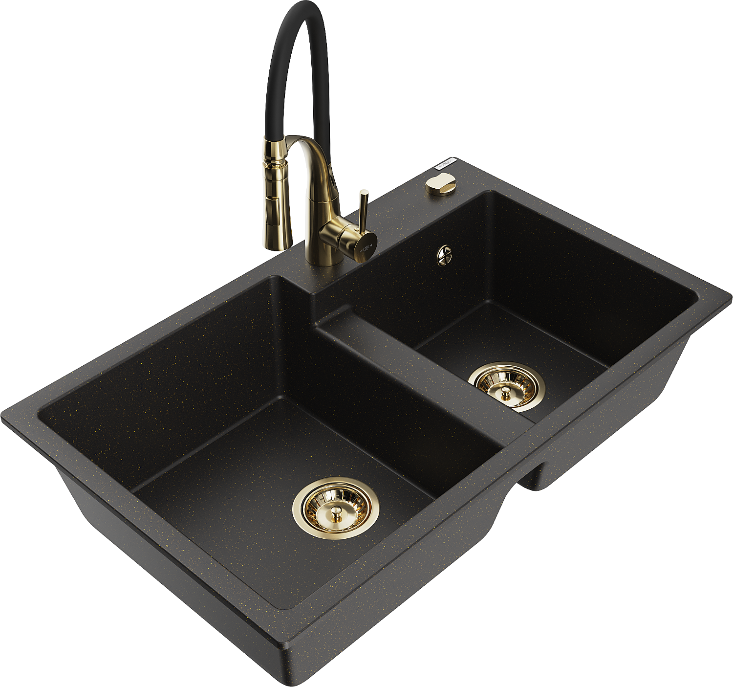 Mexen Tomas гранитна мивка с 2 камери с кухненски смесител Aster, черен/златен металик - 6516-75-73450-57-G