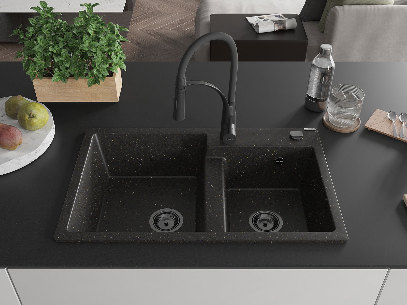 Mexen Tomas двукоморна гранитна мивка с кухненски смесител Aster, черен/златен металик - 6516-75-73450-70-B