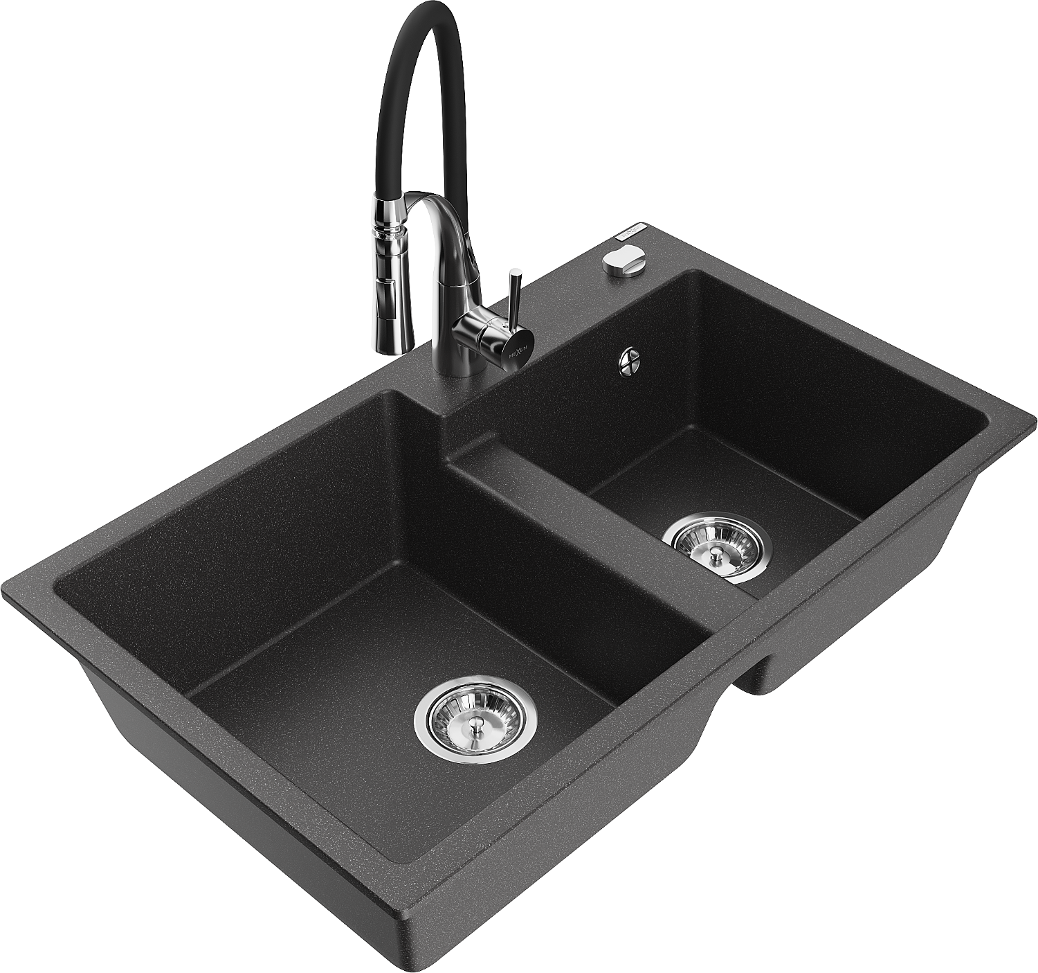 Mexen Tomas двукоморна гранитна мивка с кухненски смесител Aster, черно на пръски - 6516-76-73450-07
