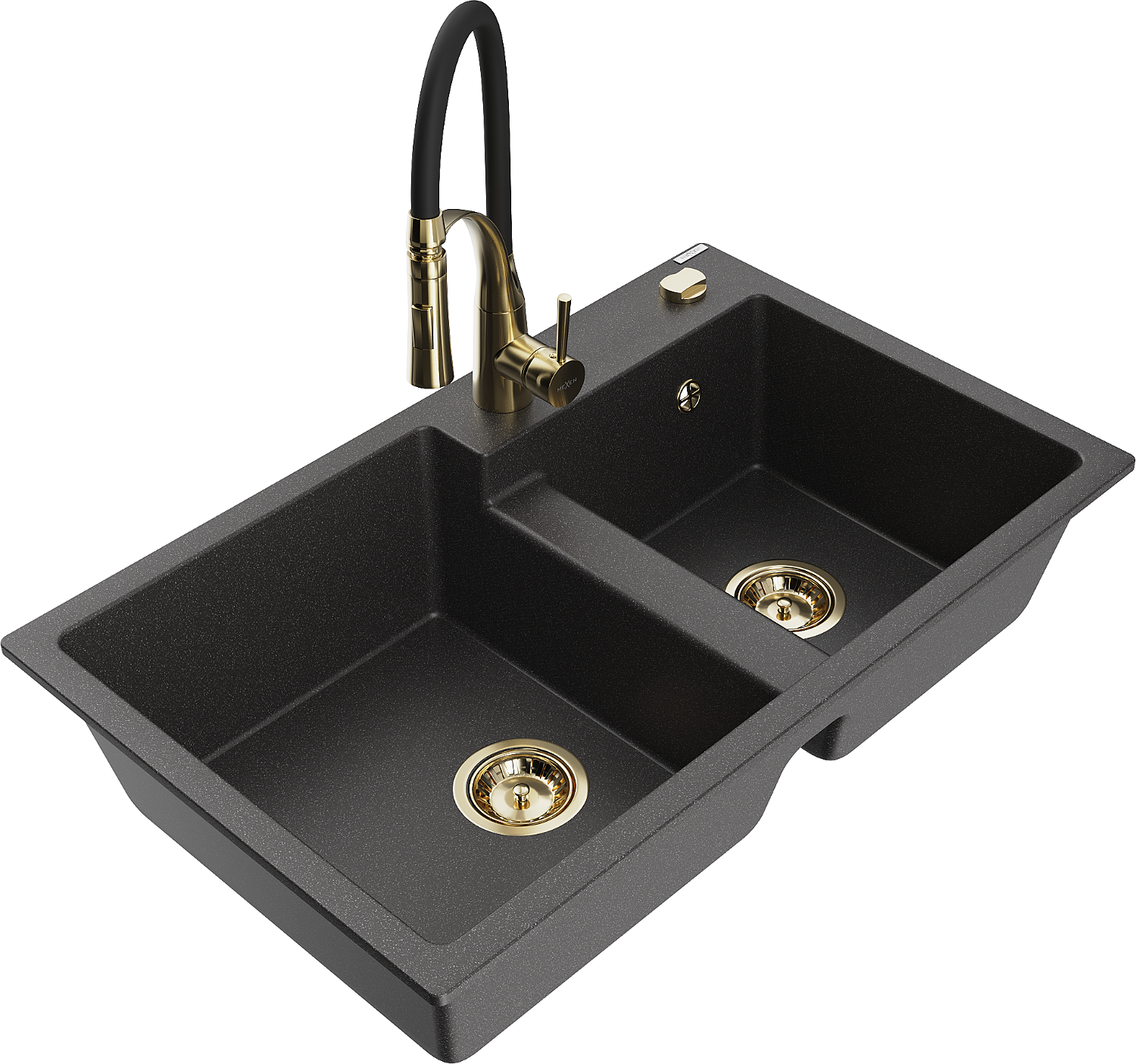 Mexen Tomas гранитна мивка с 2 отделения и кухненски смесител Aster, черен на пръски - 6516-76-73450-57-G