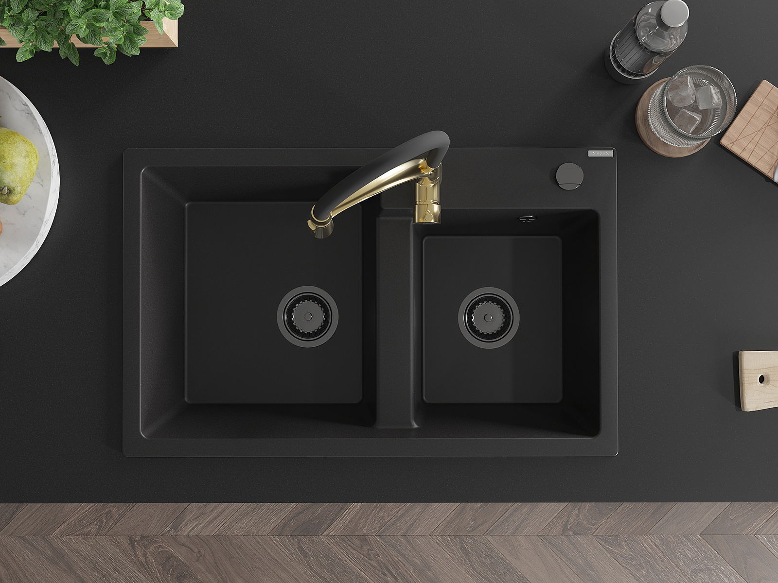 Mexen Tomas двоен гранитен кухненски мивка с батерия Aster, черен - 6516-77-73450-57-B
